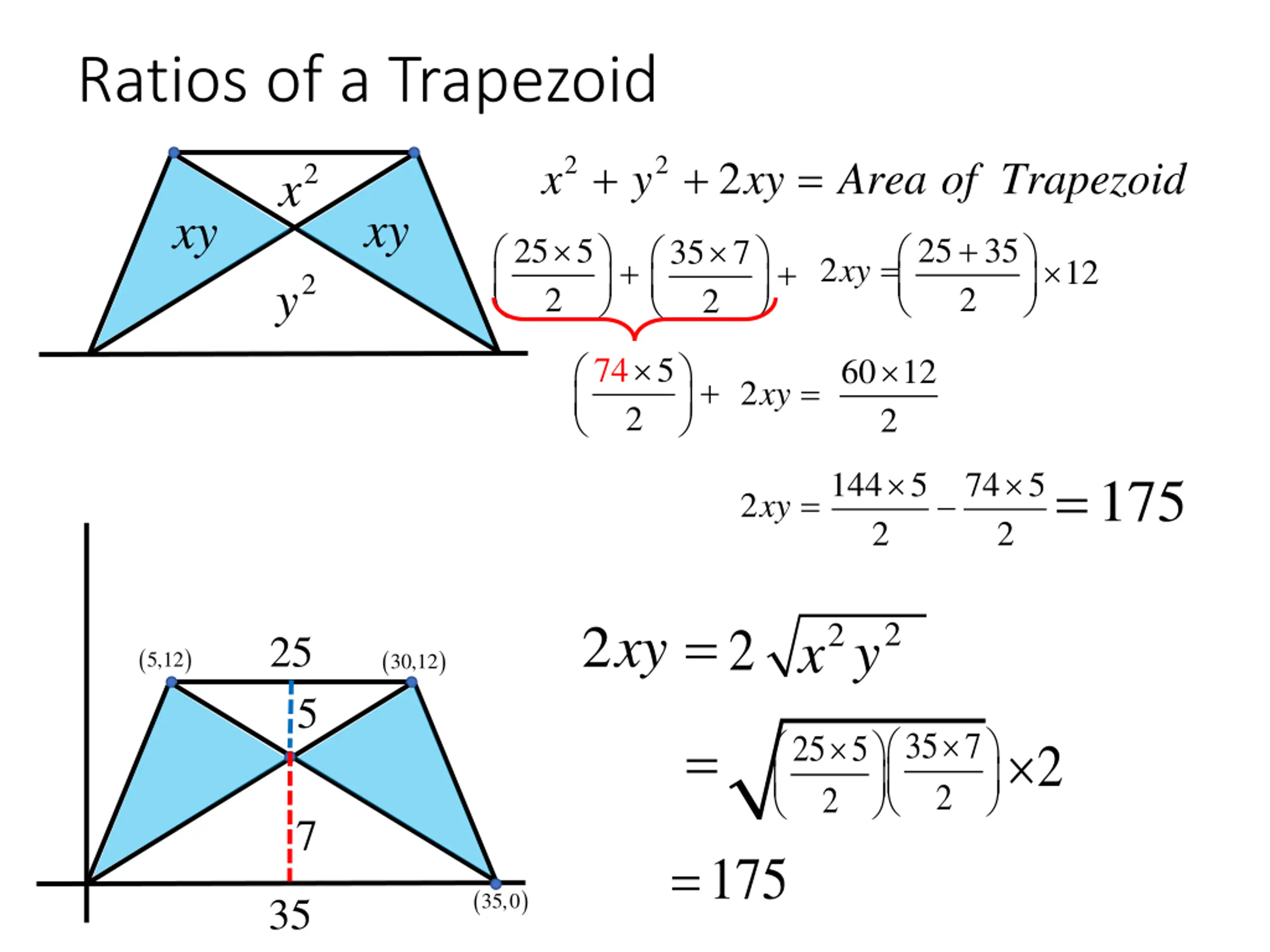 Ratios of a Trapezoid + + = 2 2 2 x y xy Area of Trapezoid 2 x xy xy + + 2xy =25 35 25 5 2 + 35 7 2 12 2 y 2 + 74 5 2 2xy =60 12 2 = 2xy =144 5 74 5 2 175 2 2xy = 2 2 2 x 175 y 25 ( ) ( ) 5,12 30,12 5 = 35 7 2 25 5 2 2 7 = ( ) 35,0 35