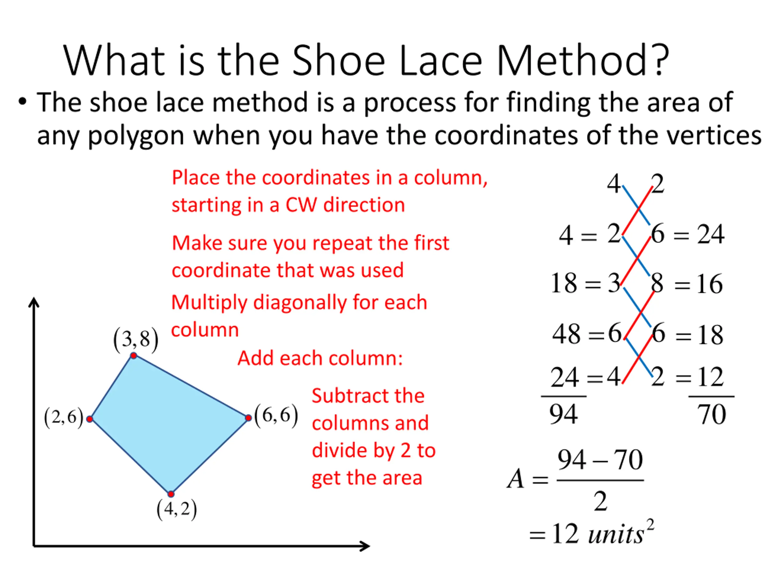 What is the Shoe Lace Method? The shoe lace method is a process for finding the area of any polygon when you have the coordinates of the vertices 4 2 Place the coordinates in a column, starting in a CW direction = 4 = 18 = 2 6 24 Make sure you repeat the first coordinate that was used Multiply diagonally for each column Add each column: = 3 8 16 48 = 24 = 94 94 = = = 6 6 4 2 ( ) 18 12 70 3,8 Subtract the columns and divide by 2 to get the area ( ) ( ) 6,6 2,6 70 A 2 ( ) 4,2 = 2 12 units