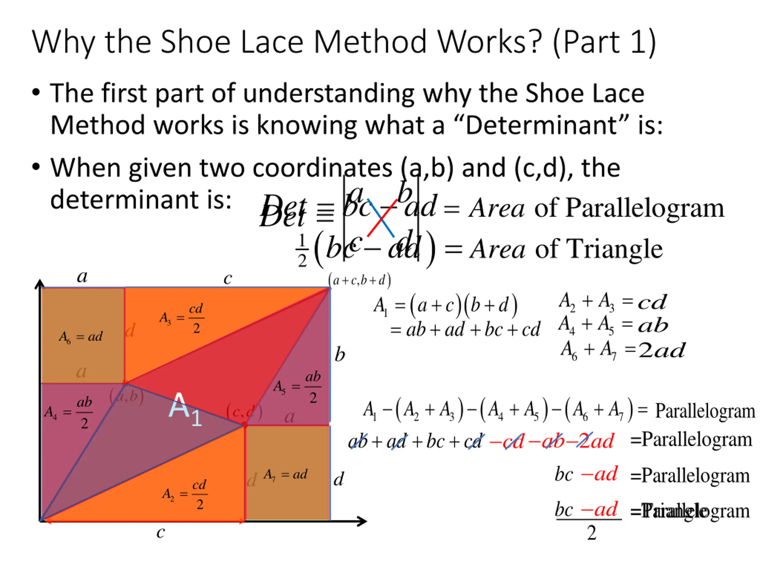 Why the Shoe Lace Method Works? (Part 1) The first part of understanding why the Shoe Lace Method works is knowing what a Determinant is: When given two coordinates (a,b) and (c,d), the determinant is: Det bc = ( a c b ad ad d = = of Parallelogram of Triangle Area Area = Det ) 1 2bc a c ( ) a c b d + + , ( )( ) + + + =cd =ab =2ad A A A A A A = = + + + bc 1A a c b ad d cd 2 3 A = + + ab cd 3 d 2 4 5 = 6 A ad b 6 7 a ab A = ( ) , a b 5 A1 ( ) ( cd + ) ( ab bc ) 2 ab ad + bc + + = Parallelogram =Parallelogram A A A A A A 2ad 2 A ( ) A = , c d a 1 + 2 + 3 4 5 6 7 4 2 ab cd ad ad =Parallelogram = 7 A ad d d cd A = 2 2 bc =Parallelogram =Triangle c