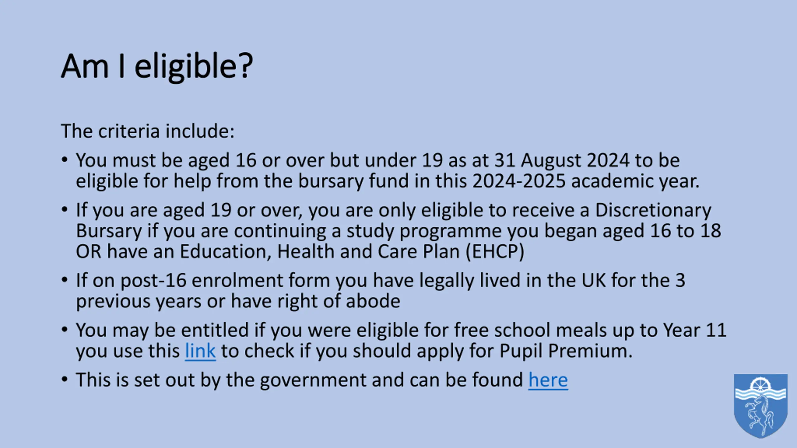 Am I eligible? Am I eligible? The criteria include: You must be aged 16 or over but under 19 as at 31 August 2024 to be eligible for help from the bursary fund in this 2024-2025 academic year. If you are aged 19 or over, you are only eligible to receive a Discretionary Bursary if you are continuing a study programme you began aged 16 to 18 OR have an Education, Health and Care Plan (EHCP) If on post-16 enrolment form you have legally lived in the UK for the 3 previous years or have right of abode You may be entitled if you were eligible for free school meals up to Year 11 you use this link to check if you should apply for Pupil Premium. This is set out by the government and can be found here