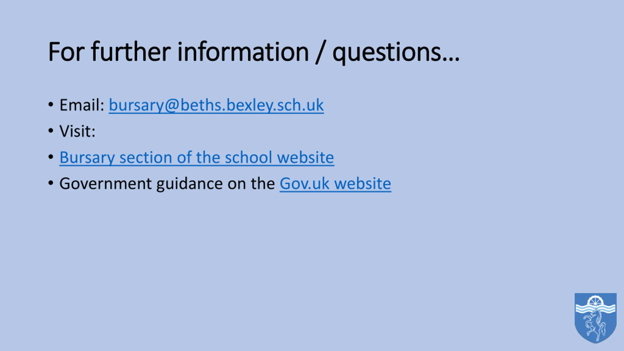 For further information / questions For further information / questions Email: bursary@beths.bexley.sch.uk Visit: Bursary section of the school website Government guidance on the Gov.uk website