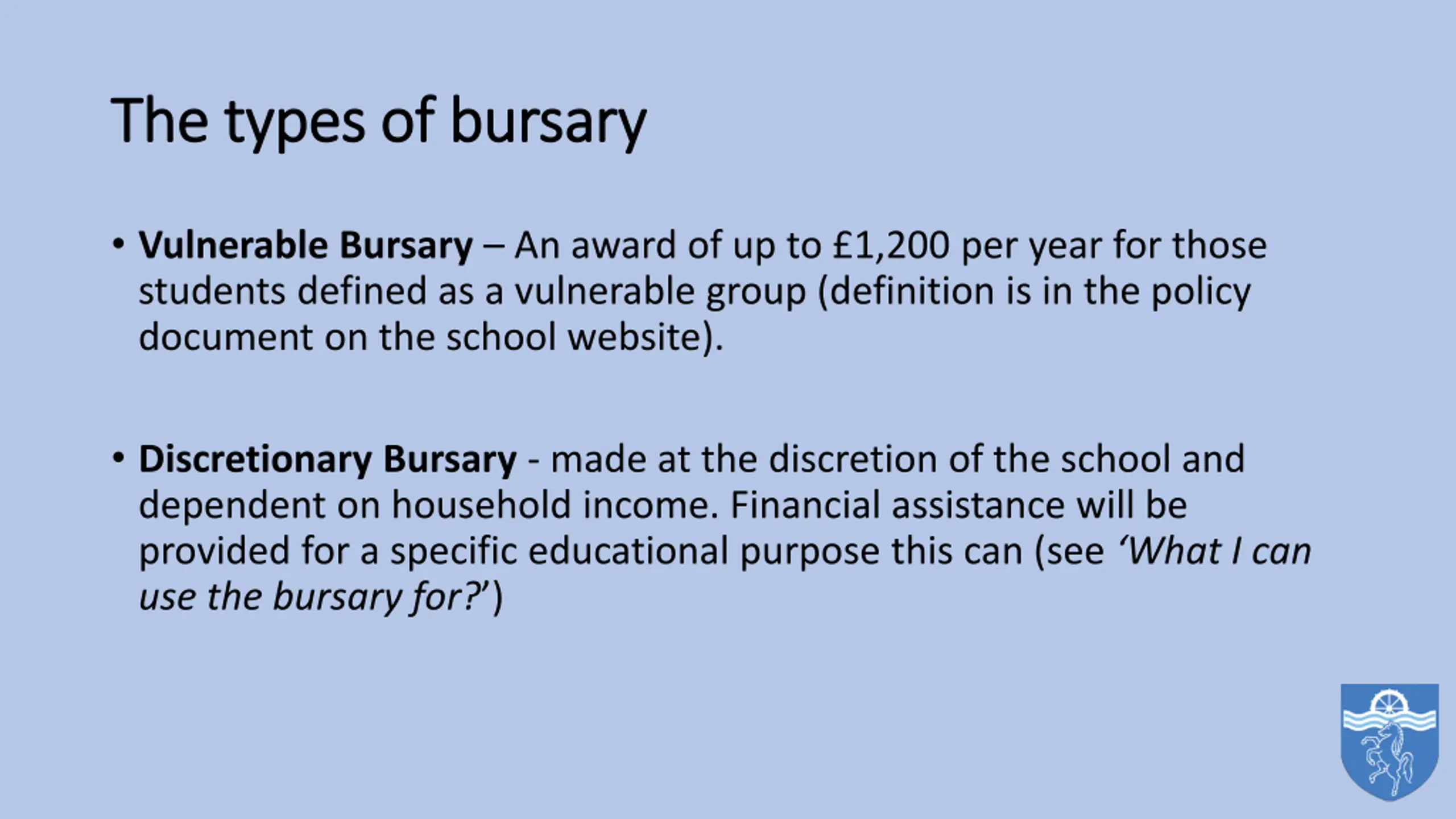 The types of bursary The types of bursary Vulnerable Bursary An award of up to 1,200 per year for those students defined as a vulnerable group (definition is in the policy document on the school website). Discretionary Bursary - made at the discretion of the school and dependent on household income. Financial assistance will be provided for a specific educational purpose this can (see What I can use the bursary for? )