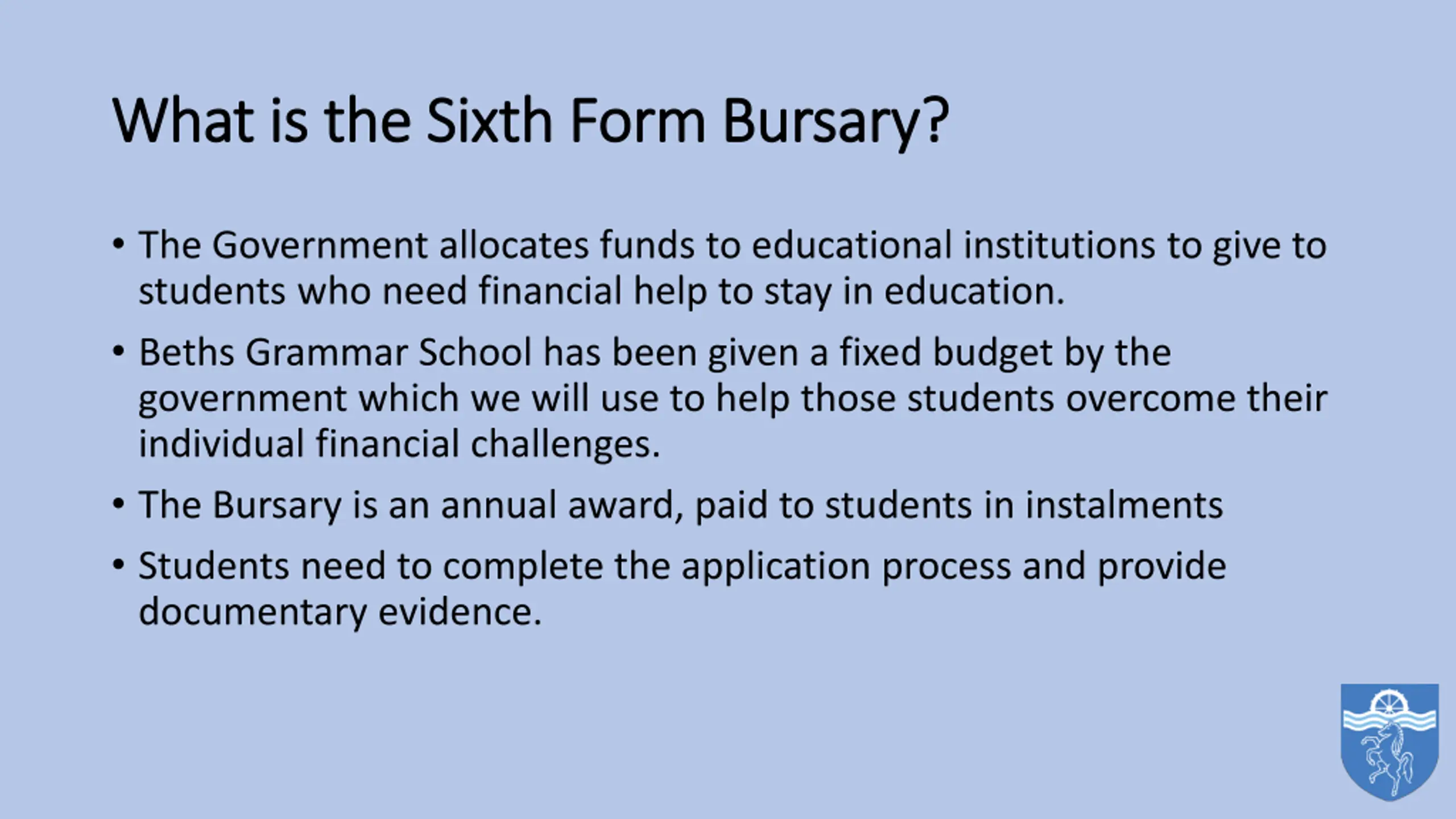 What is the Sixth Form Bursary? What is the Sixth Form Bursary? The Government allocates funds to educational institutions to give to students who need financial help to stay in education. Beths Grammar School has been given a fixed budget by the government which we will use to help those students overcome their individual financial challenges. The Bursary is an annual award, paid to students in instalments Students need to complete the application process and provide documentary evidence.