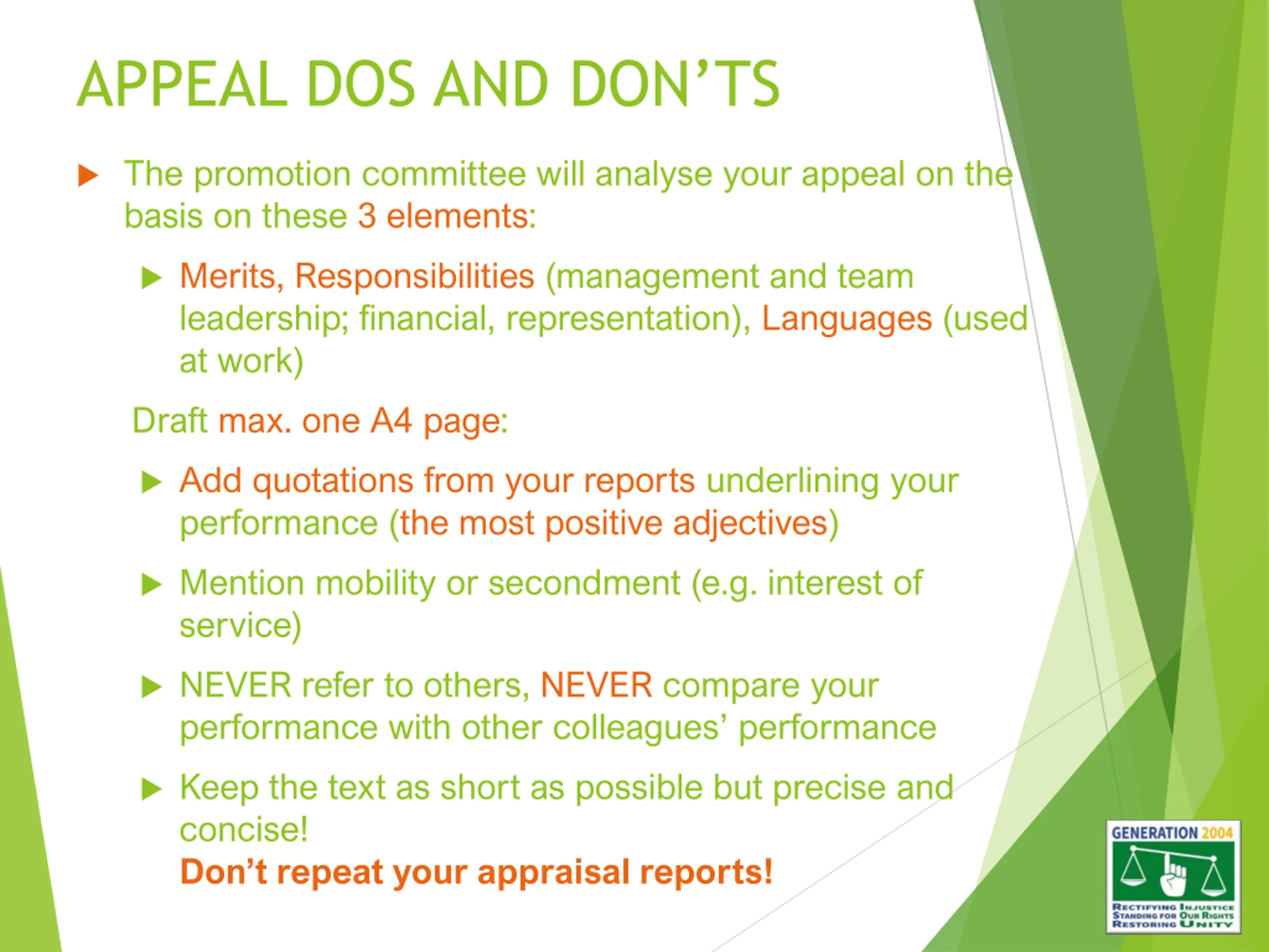 APPEAL DOS AND DONTS The promotion committee will analyse your appeal on the basis on these 3 elements: Merits, Responsibilities (management and team leadership; financial, representation), Languages (used at work) Draft max. one A4 page: Add quotations from your reports underlining your performance (the most positive adjectives) Mention mobility or secondment (e.g. interest of service) NEVER refer to others, NEVER compare your performance with other colleagues performance Keep the text as short as possible but precise and concise! Don t repeat your appraisal reports!