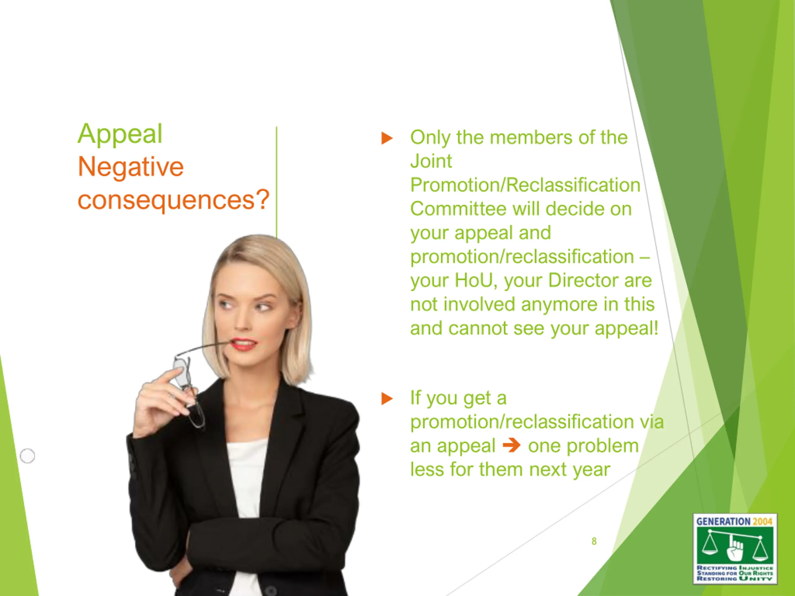 Appeal Negative consequences? Only the members of the Joint Promotion/Reclassification Committee will decide on your appeal and promotion/reclassification your HoU, your Director are not involved anymore in this and cannot see your appeal! If you get a promotion/reclassification via an appeal one problem less for them next year 8