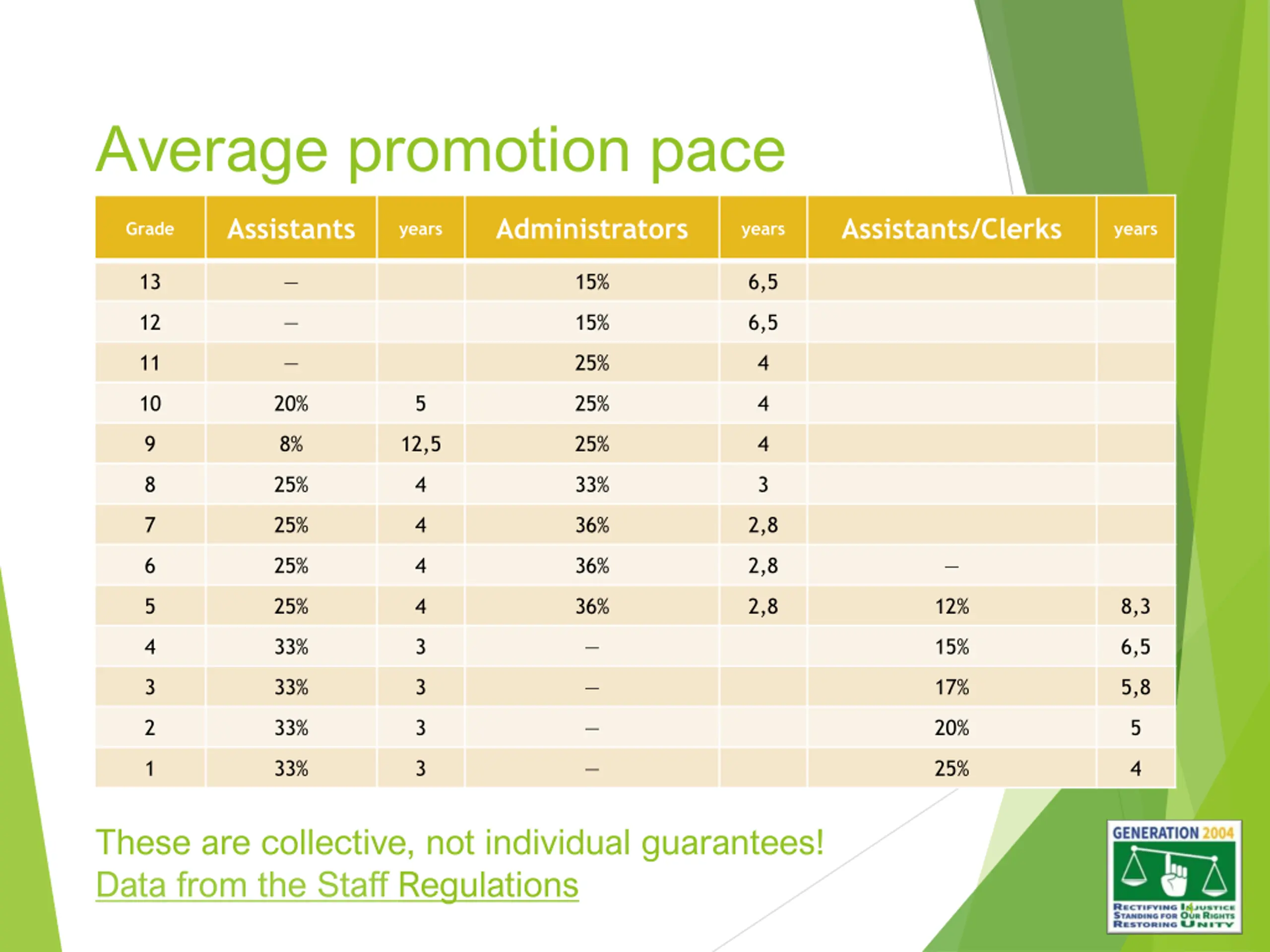 Average promotion pace Assistants Administrators Assistants/Clerks Grade years years years 13 15% 6,5 12 15% 6,5 11 25% 4 10 20% 5 25% 4 9 8% 12,5 25% 4 8 25% 4 33% 3 7 25% 4 36% 2,8 6 25% 4 36% 2,8 5 25% 4 36% 2,8 12% 8,3 4 33% 3 15% 6,5 3 33% 3 17% 5,8 2 33% 3 20% 5 1 33% 3 25% 4 These are collective, not individual guarantees! Data from the Staff Regulations 4