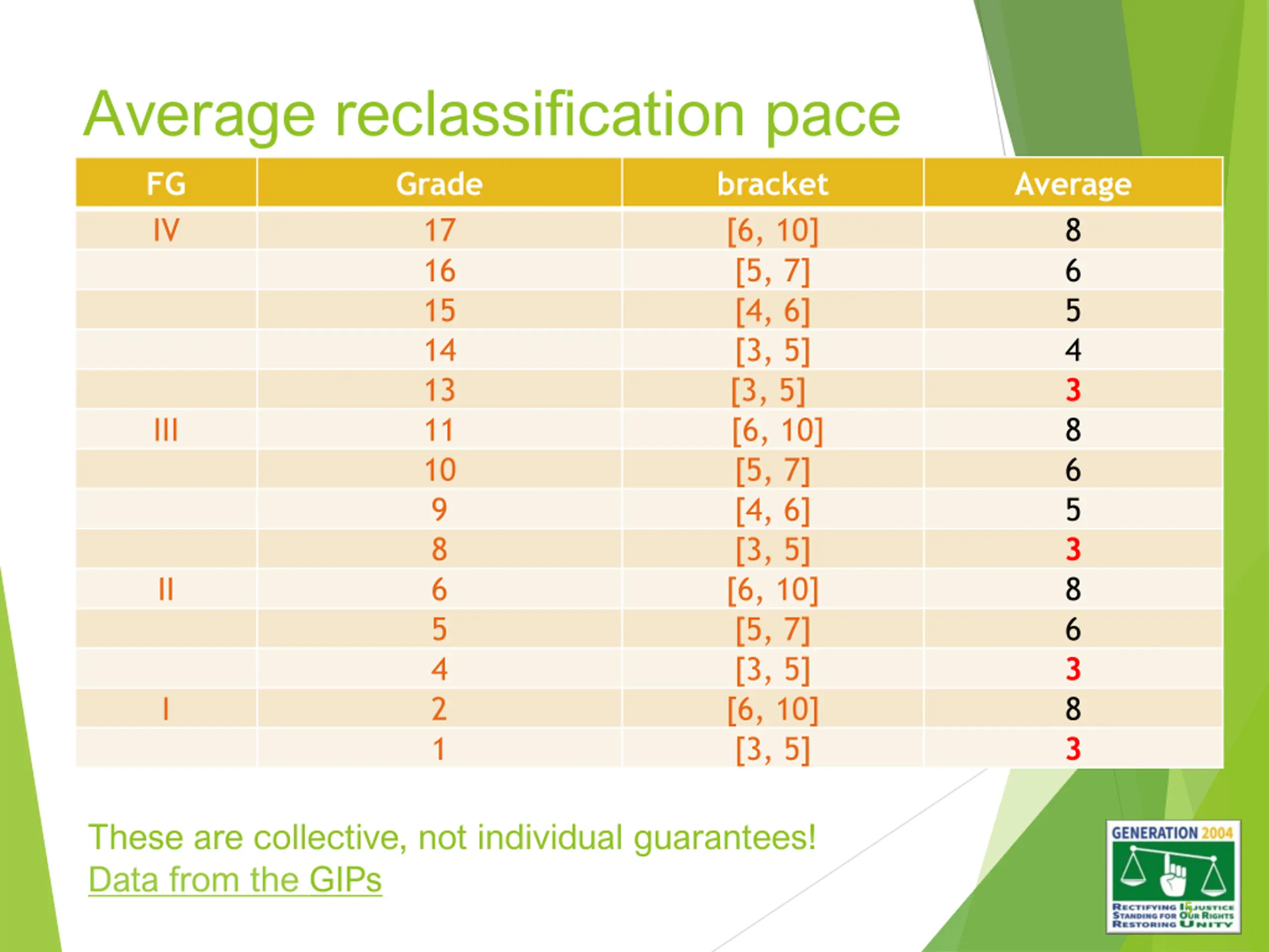 Average reclassification pace FG Grade IV 17 16 15 14 13 III 11 10 9 8 II 6 5 4 I 2 1 bracket [6, 10] [5, 7] [4, 6] [3, 5] [3, 5] [6, 10] [5, 7] [4, 6] [3, 5] [6, 10] [5, 7] [3, 5] [6, 10] [3, 5] Average 8 6 5 4 3 8 6 5 3 8 6 3 8 3 These are collective, not individual guarantees! Data from the GIPs 5 5