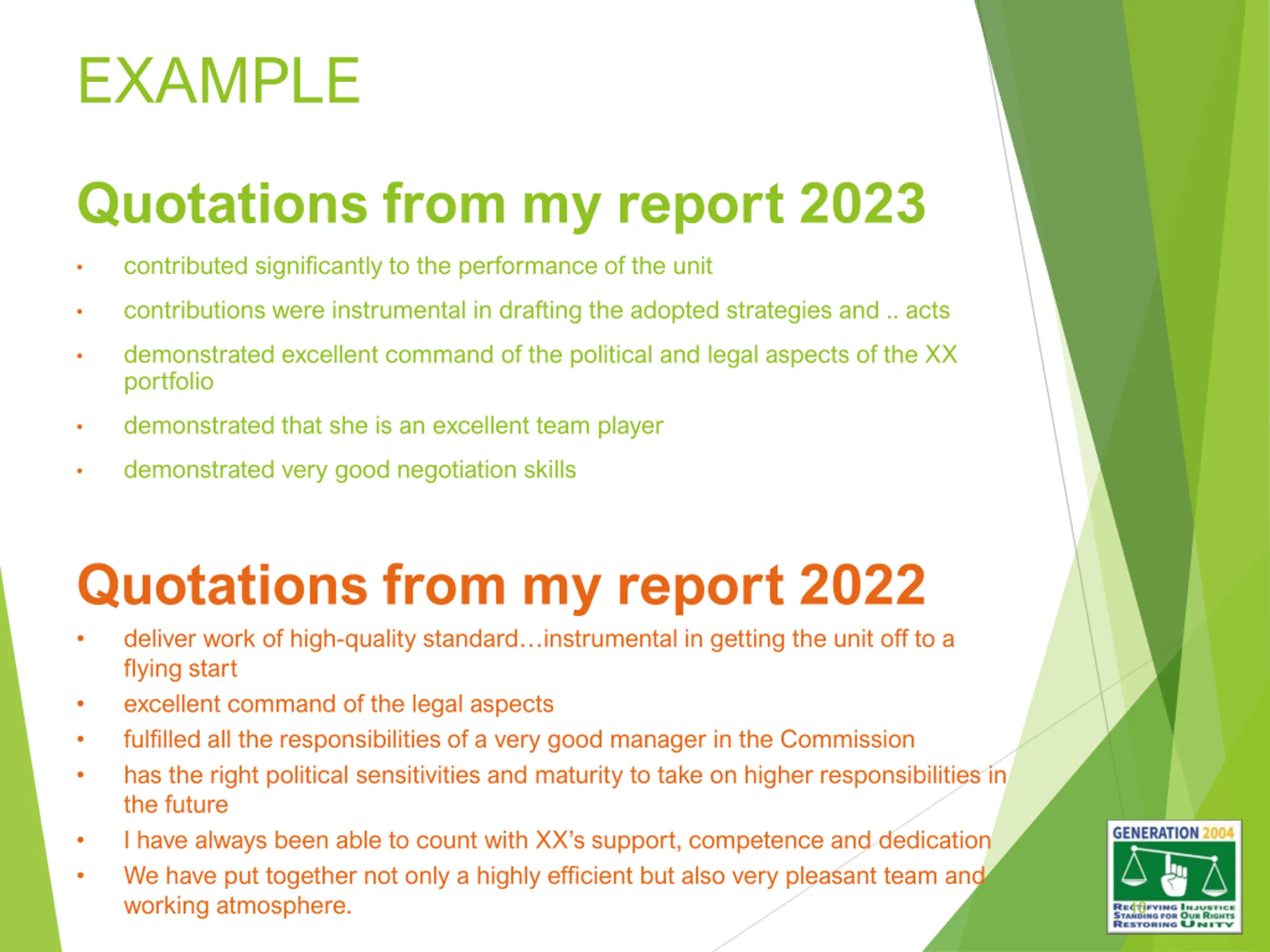 EXAMPLE Quotations from my report 2023 contributed significantly to the performance of the unit contributions were instrumental in drafting the adopted strategies and .. acts demonstrated excellent command of the political and legal aspects of the XX portfolio demonstrated that she is an excellent team player demonstrated very good negotiation skills Quotations from my report 2022 deliver work of high-quality standard instrumental in getting the unit off to a flying start excellent command of the legal aspects fulfilled all the responsibilities of a very good manager in the Commission has the right political sensitivities and maturity to take on higher responsibilities in the future I have always been able to count with XX s support, competence and dedication We have put together not only a highly efficient but also very pleasant team and working atmosphere. 10