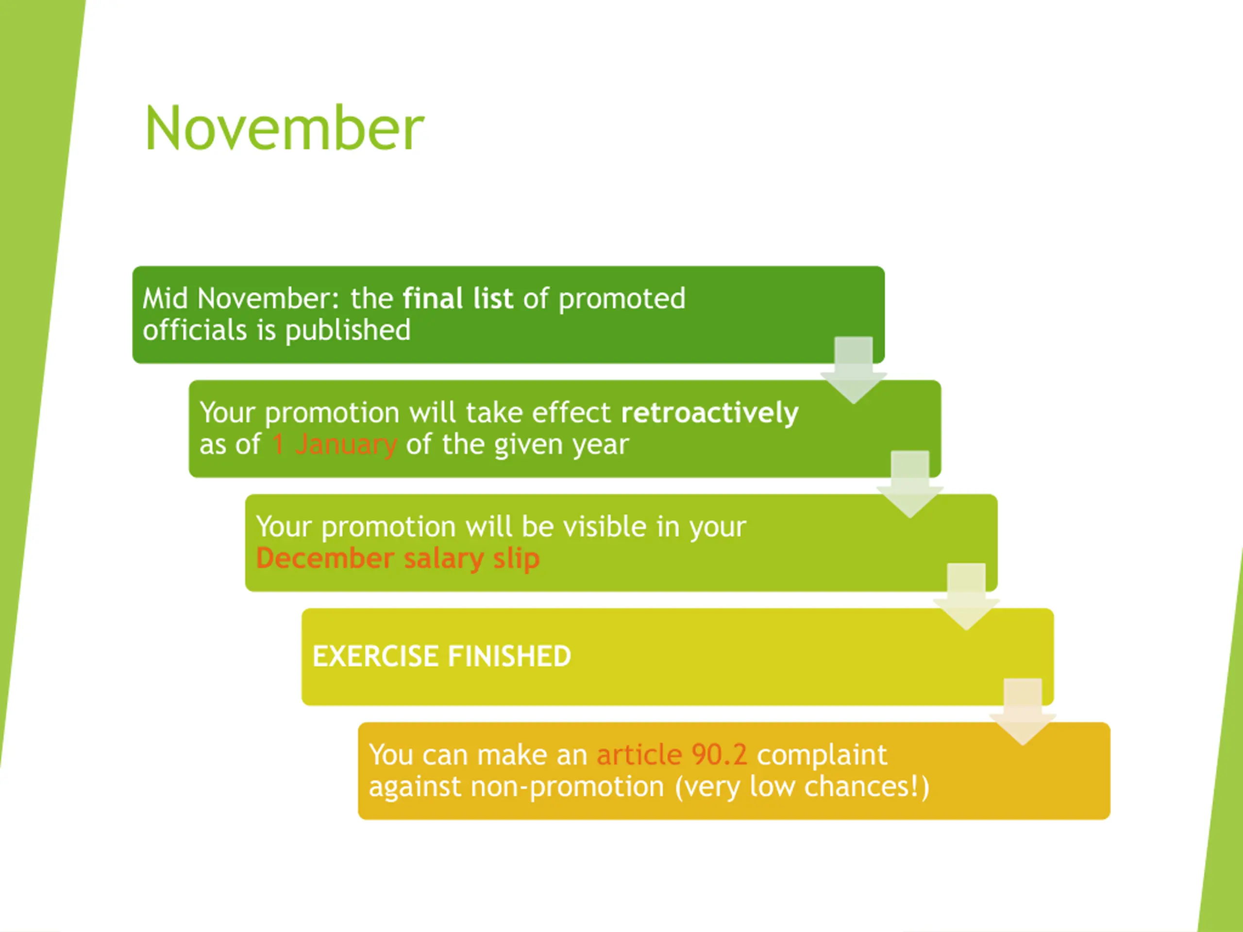 November Mid November: the final list of promoted officials is published Your promotion will take effect retroactively as of 1 January of the given year Your promotion will be visible in your December salary slip EXERCISE FINISHED You can make an article 90.2 complaint against non-promotion (very low chances!)