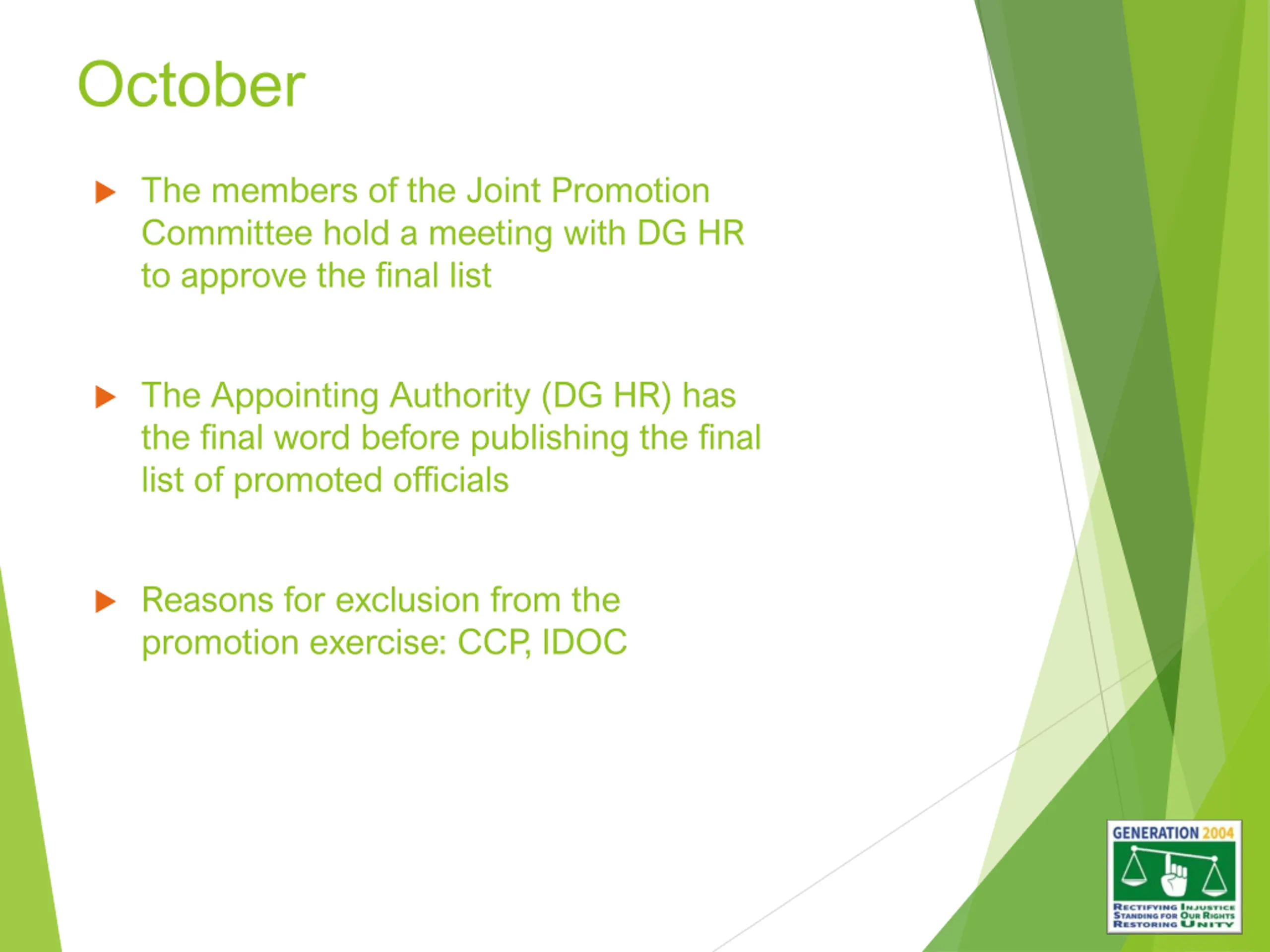 October The members of the Joint Promotion Committee hold a meeting with DG HR to approve the final list The Appointing Authority (DG HR) has the final word before publishing the final list of promoted officials Reasons for exclusion from the promotion exercise: CCP, IDOC