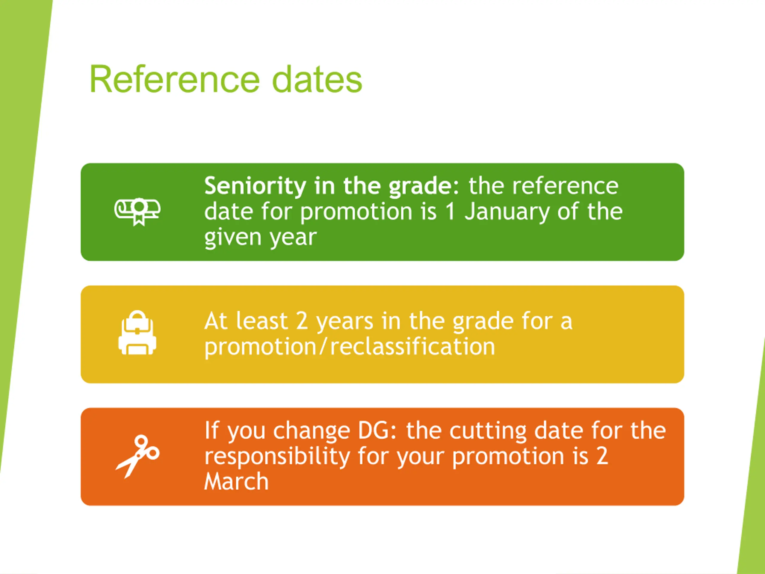Reference dates Seniority in the grade: the reference date for promotion is 1 January of the given year At least 2 years in the grade for a promotion/reclassification If you change DG: the cutting date for the responsibility for your promotion is 2 March