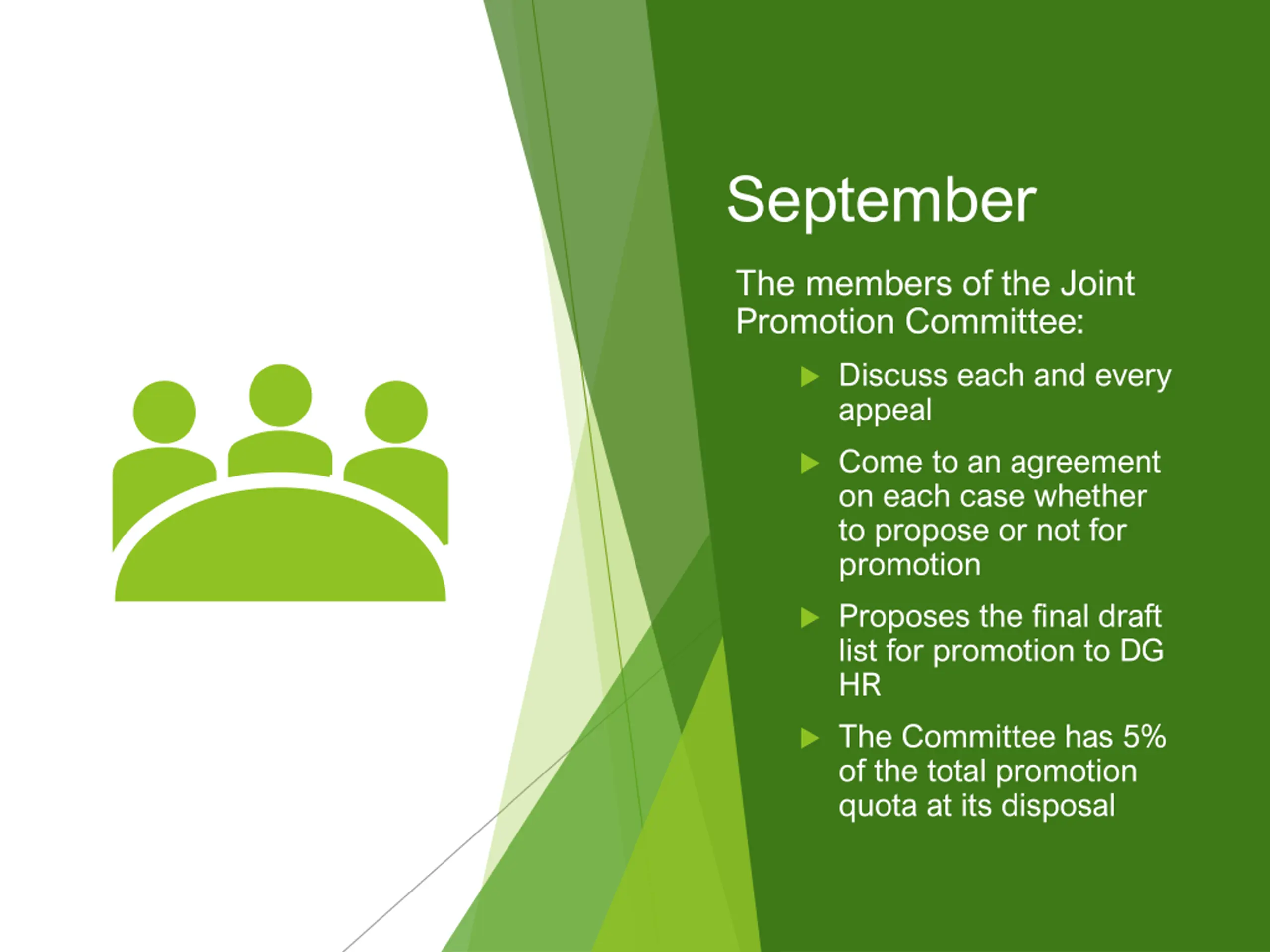 September The members of the Joint Promotion Committee: Discuss each and every appeal Come to an agreement on each case whether to propose or not for promotion Proposes the final draft list for promotion to DG HR The Committee has 5% of the total promotion quota at its disposal