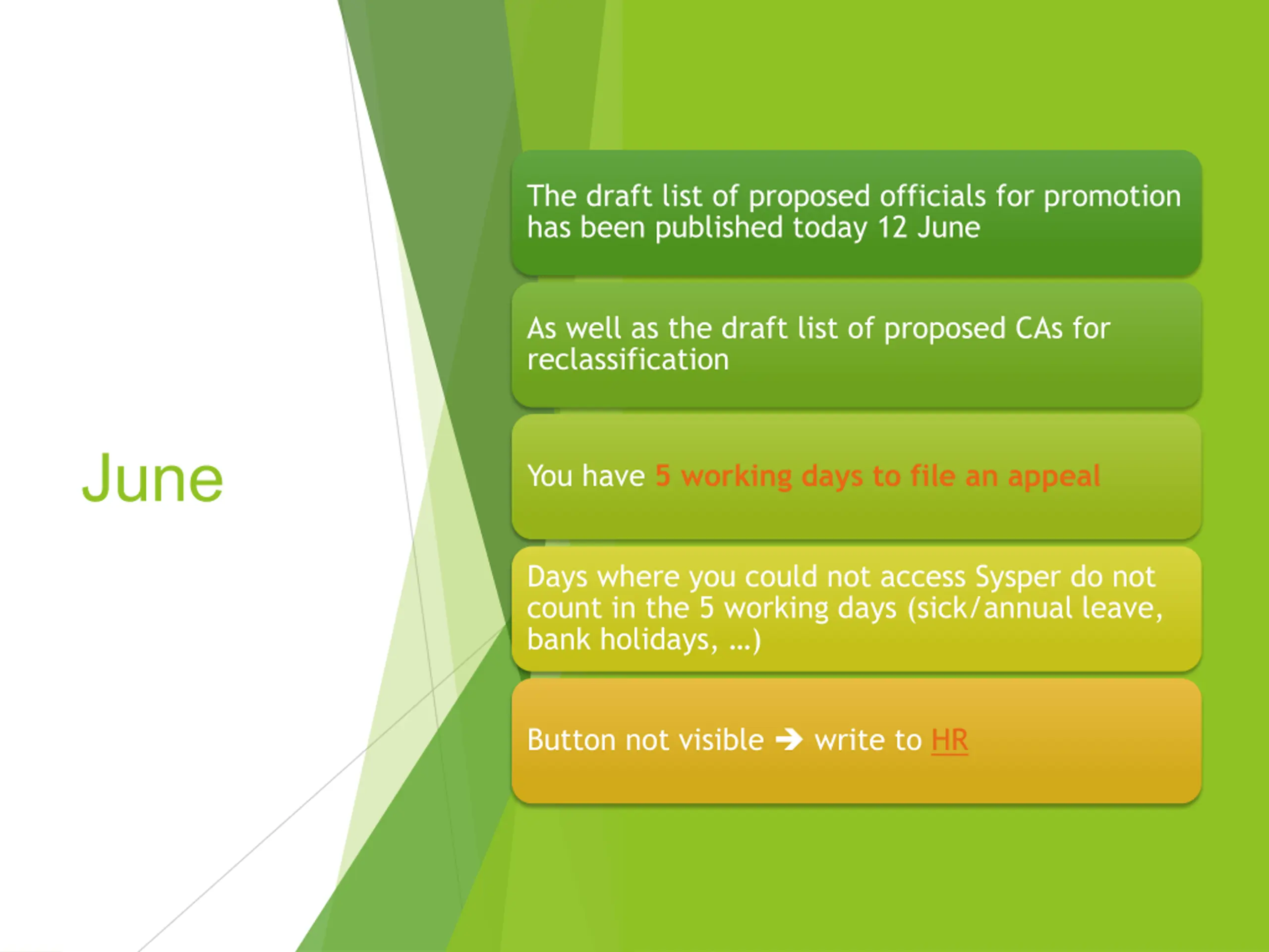 The draft list of proposed officials for promotion has been published today 12 June As well as the draft list of proposed CAs for reclassification June You have 5 working days to file an appeal Days where you could not access Sysper do not count in the 5 working days (sick/annual leave, bank holidays, ) Button not visible write to HR HR