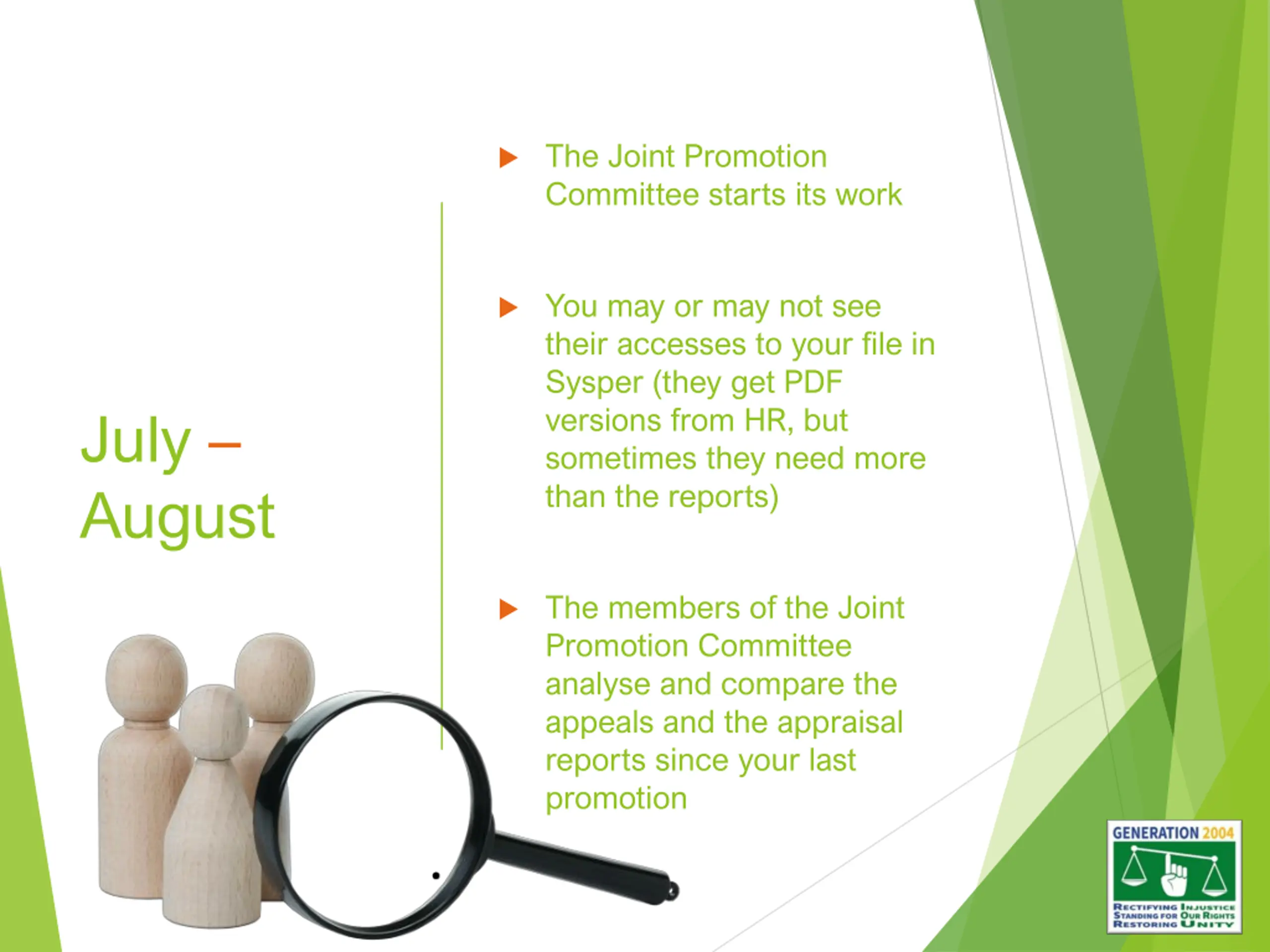 The Joint Promotion Committee starts its work You may or may not see their accesses to your file in Sysper (they get PDF versions from HR, but sometimes they need more than the reports) July August The members of the Joint Promotion Committee analyse and compare the appeals and the appraisal reports since your last promotion