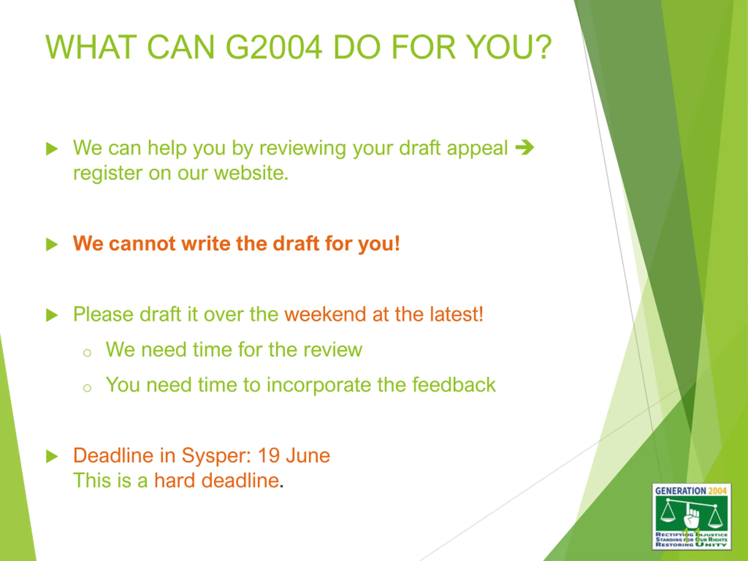 WHAT CAN G2004 DO FOR YOU? We can help you by reviewing your draft appeal register on our website. We cannot write the draft for you! Please draft it over the weekend at the latest! o We need time for the review o You need time to incorporate the feedback Deadline in Sysper: 19 June This is a hard deadline. 11