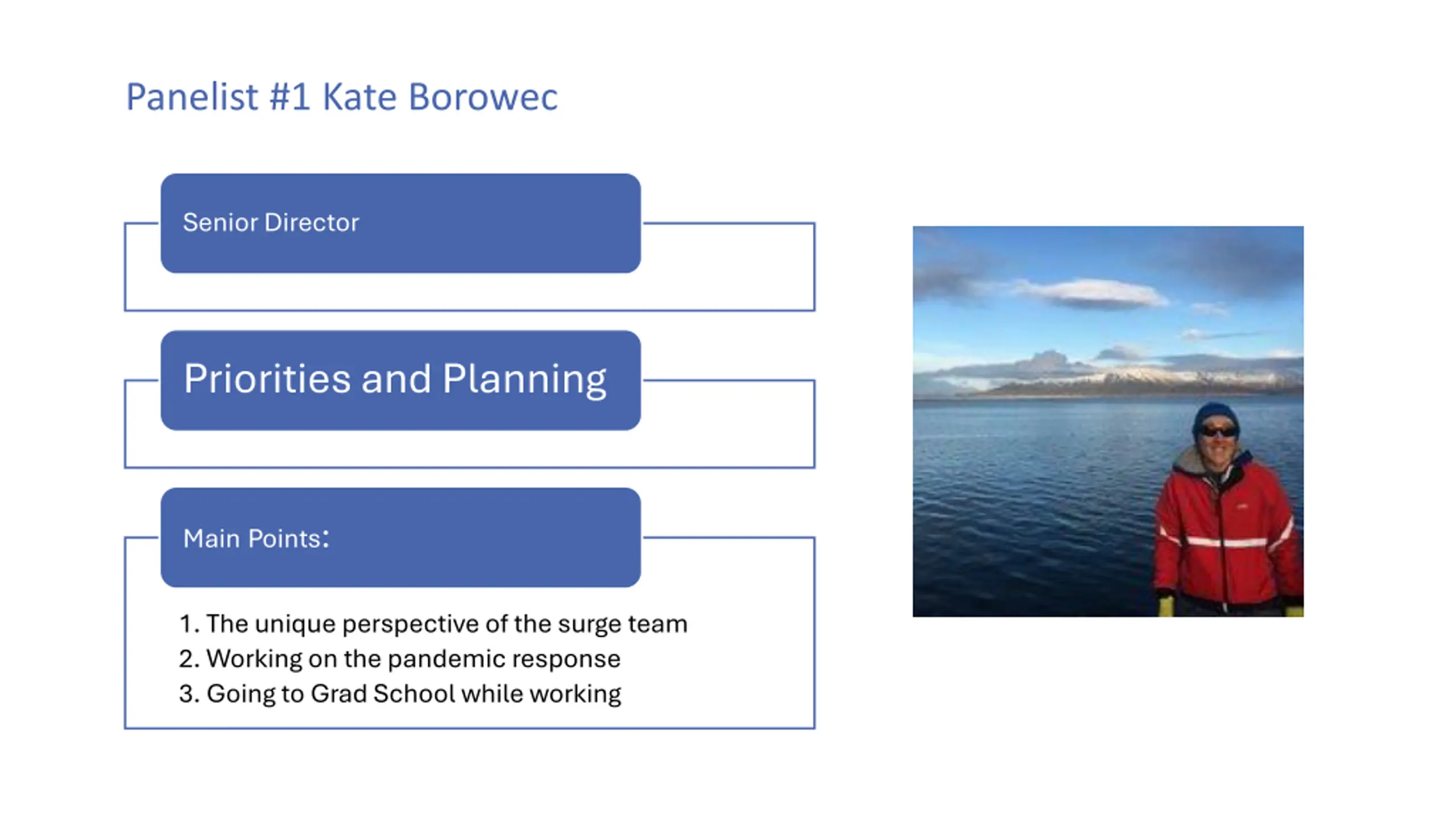 Panelist #1 Kate Borowec Senior Director Priorities and Planning MainPoints: 1. The unique perspective of the surge team 2. Working on the pandemic response 3. Going to Grad School while working