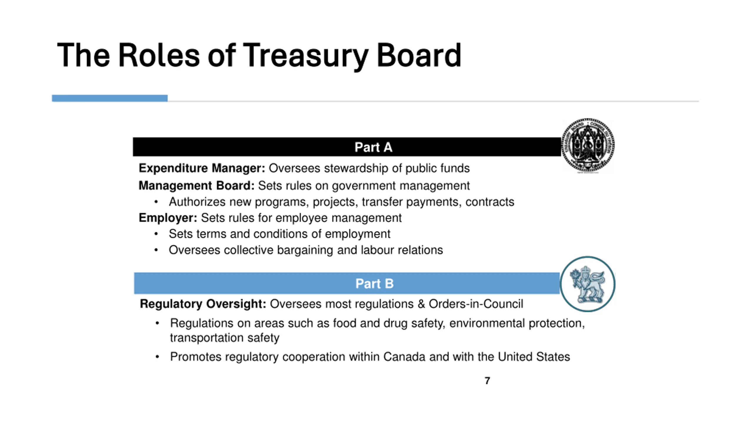 The Roles of Treasury Board The Roles of Treasury Board Part A Expenditure Manager: Oversees stewardship of public funds Management Board: Sets rules on government management Authorizes new programs, projects, transfer payments, contracts Employer: Sets rules for employee management Sets terms and conditions of employment Oversees collective bargaining and labour relations Part B Regulatory Oversight: Oversees most regulations & Orders-in-Council Regulations on areas such as food and drug safety, environmental protection, transportation safety Promotes regulatory cooperation within Canada and with the United States 7