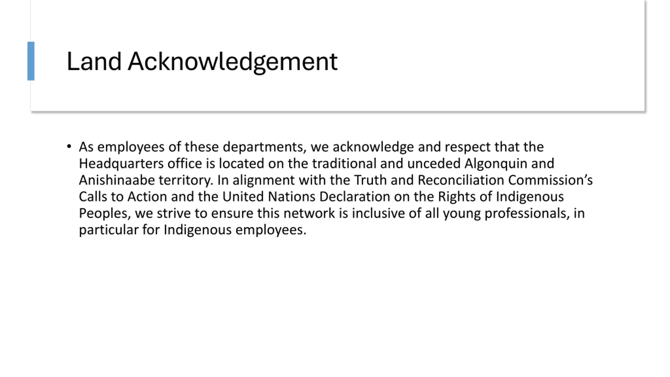UNCLASSIFIED / NON CLASSIFI Land Acknowledgement As employees of these departments, we acknowledge and respect that the Headquarters office is located on the traditional and unceded Algonquin and Anishinaabe territory. In alignment with the Truth and Reconciliation Commission s Calls to Action and the United Nations Declaration on the Rights of Indigenous Peoples, we strive to ensure this network is inclusive of all young professionals, in particular for Indigenous employees.