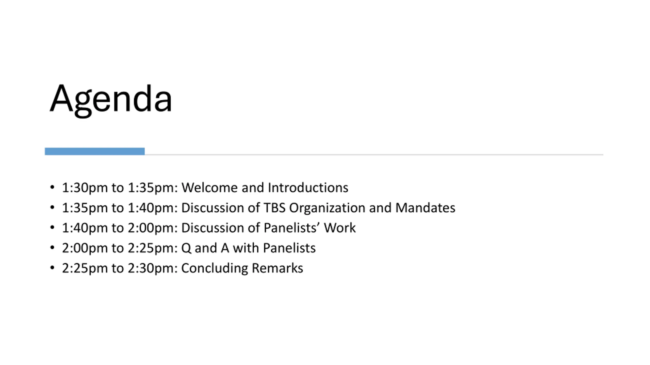 UNCLASSIFIED / NON CLASSIFI Agenda 1:30pm to 1:35pm: Welcome and Introductions 1:35pm to 1:40pm: Discussion of TBS Organization and Mandates 1:40pm to 2:00pm: Discussion of Panelists Work 2:00pm to 2:25pm: Q and A with Panelists 2:25pm to 2:30pm: Concluding Remarks