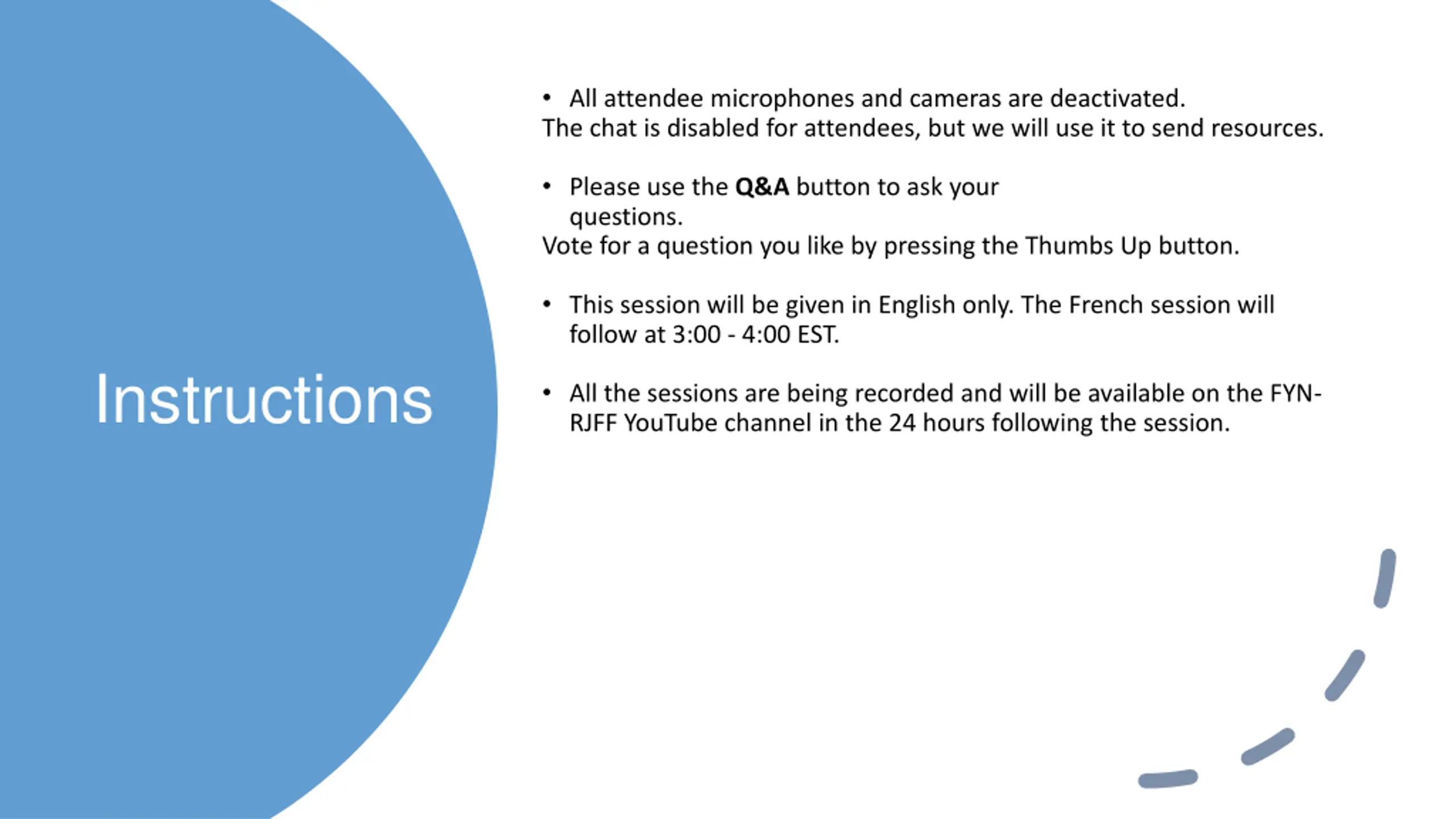 UNCLASSIFIED / NON CLASSIFI All attendee microphones and cameras are deactivated. The chat is disabled for attendees, but we will use it to send resources. Please use the Q&A button to ask your questions. Vote for a question you like by pressing the Thumbs Up button. This session will be given in English only. The French session will follow at 3:00 - 4:00 EST. Instructions All the sessions are being recorded and will be available on the FYN- RJFF YouTube channel in the 24 hours following the session.
