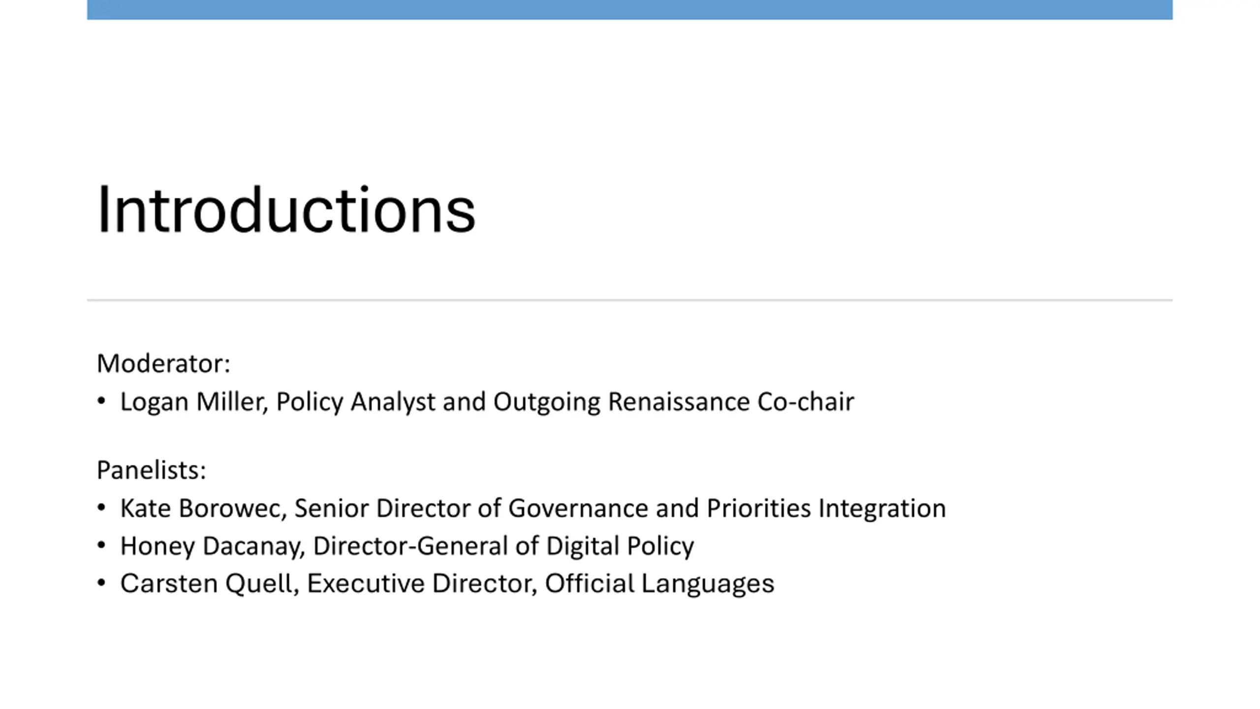 UNCLASSIFIED / NON CLASSIFI Introductions Moderator: Logan Miller, Policy Analyst and Outgoing Renaissance Co-chair Panelists: Kate Borowec, Senior Director of Governance and Priorities Integration Honey Dacanay, Director-General of Digital Policy Carsten Quell, Executive Director, Official Languages