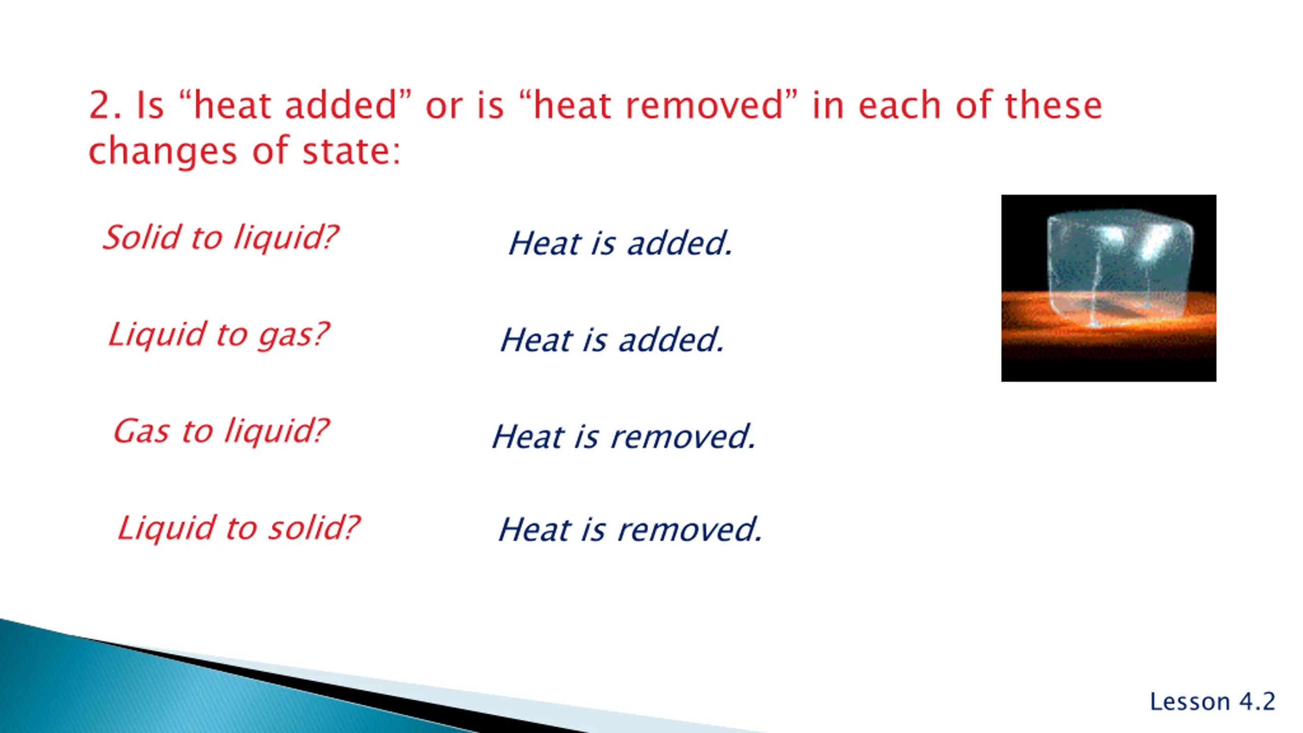 2. Is heat added or is heat removed in each of these changes of state: Solid to liquid? Heat is added. Liquid to gas? Heat is added. Gas to liquid? Heat is removed. Liquid to solid? Heat is removed. Lesson 4.2