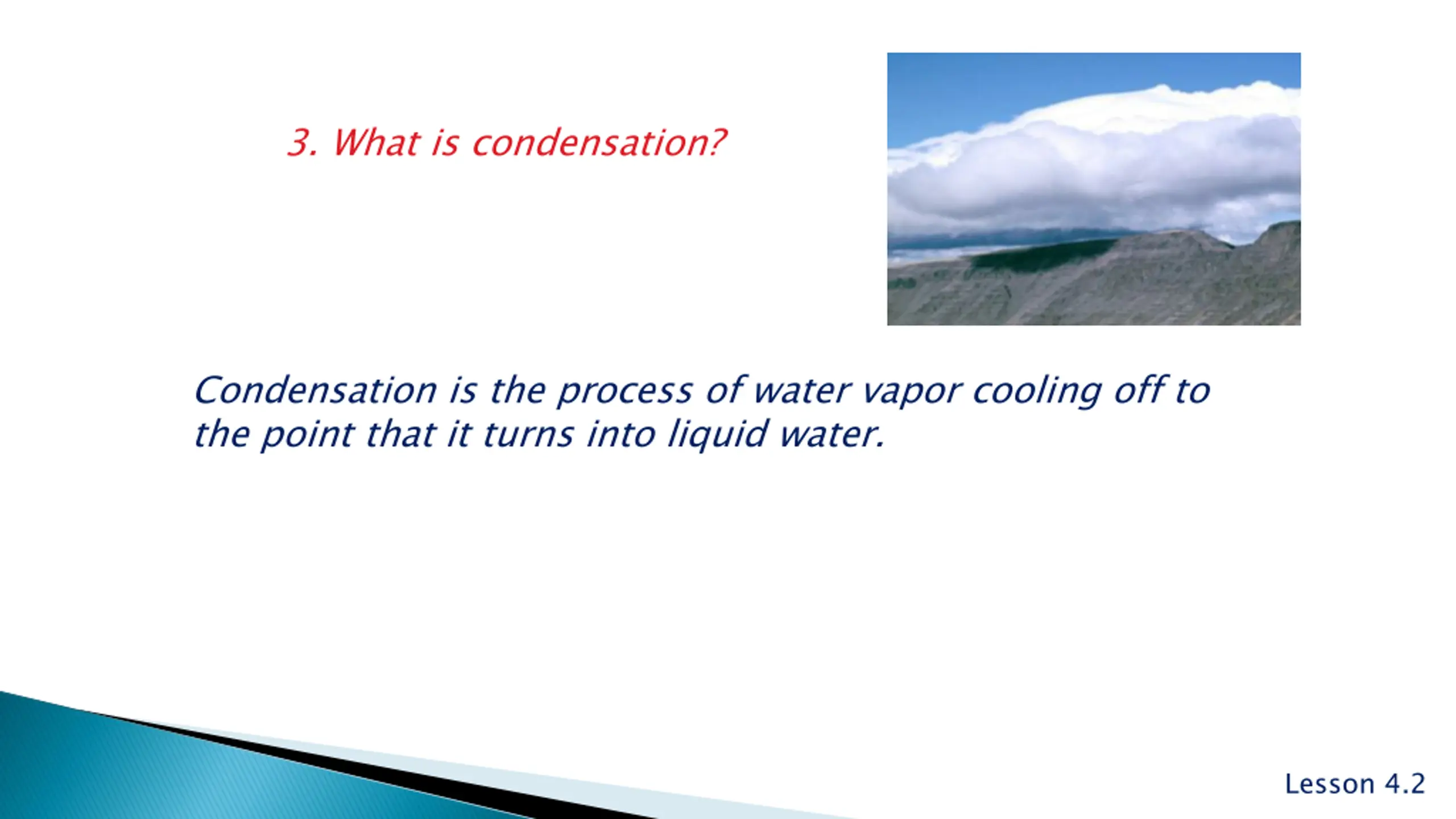 Clouds over Kiger Notch, Steen's Mountain, Oregon. 3. What is condensation? Condensation is the process of water vapor cooling off to the point that it turns into liquid water. Lesson 4.2