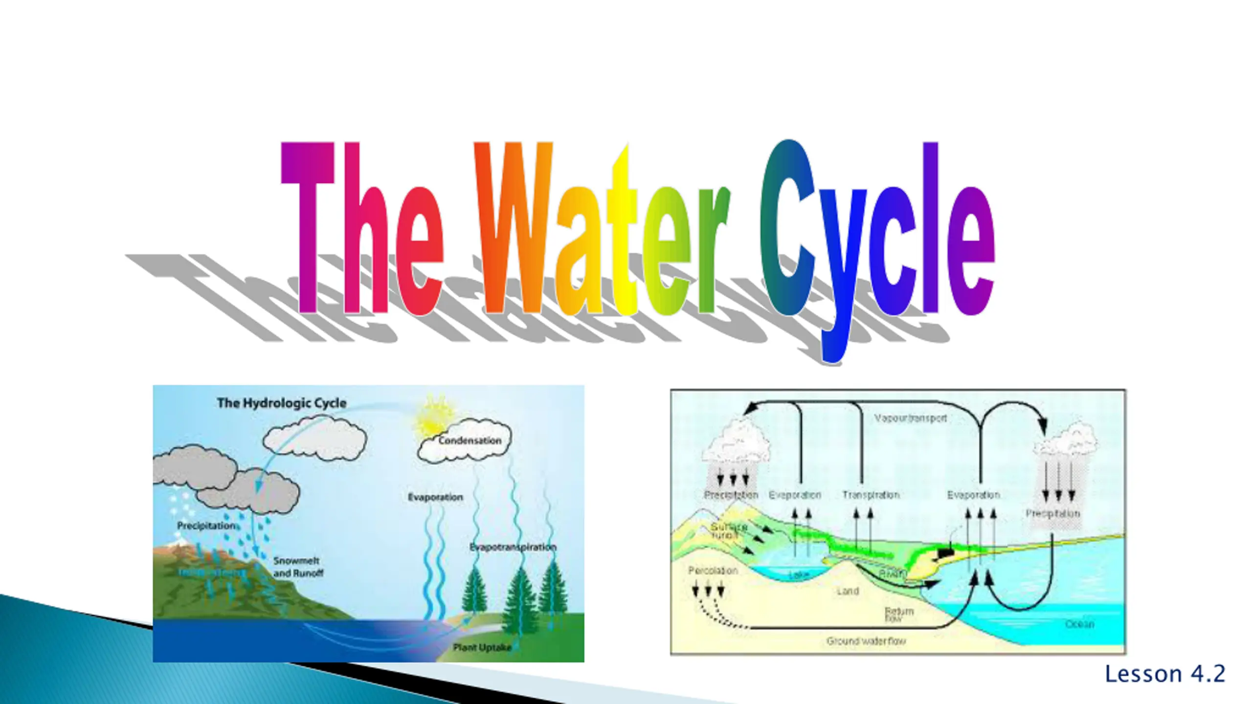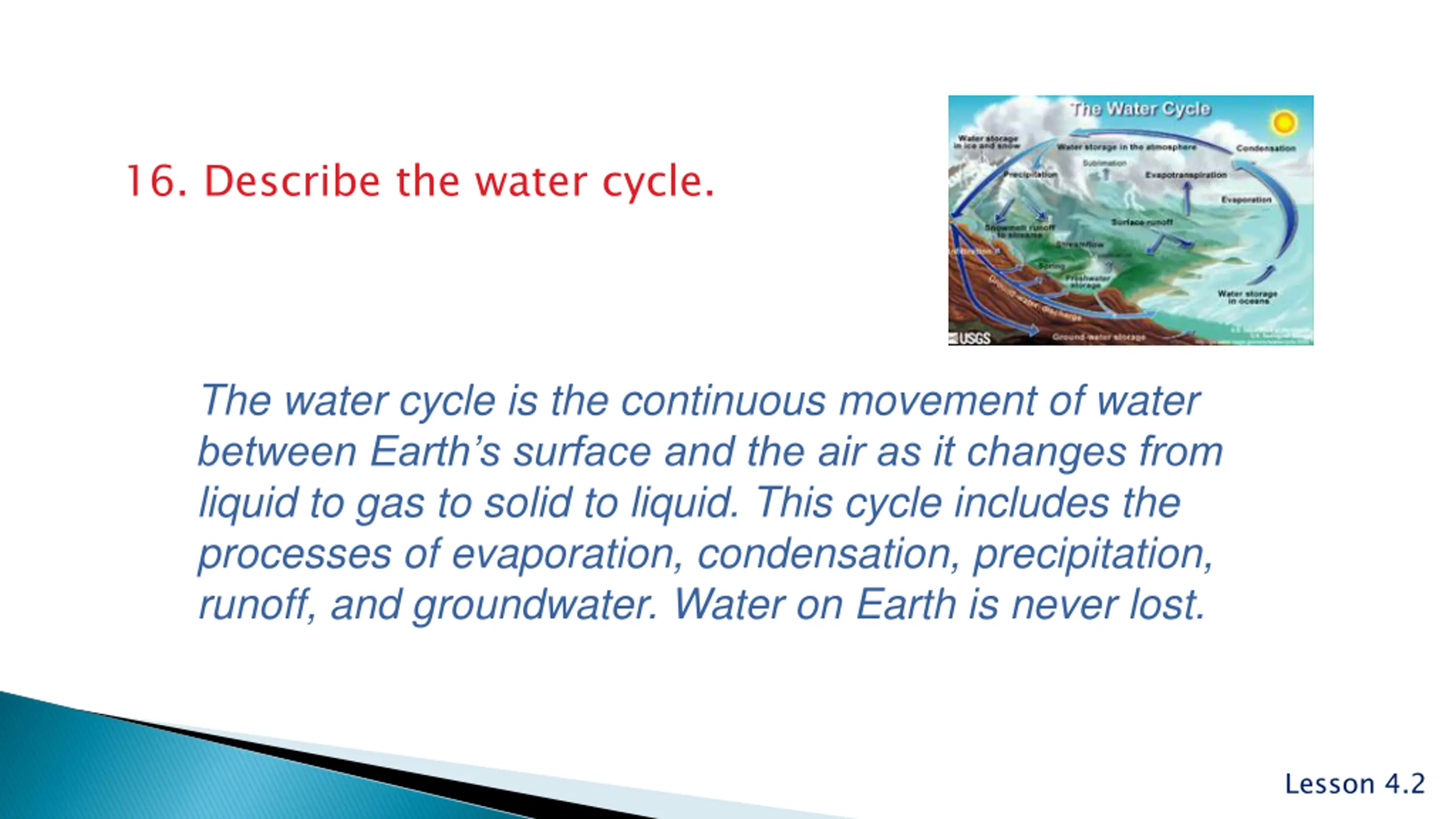 http://upload.wikimedia.org/wikipedia/commons/thumb/9/94/Water_cycle.png/250px-Water_cycle.pnghttp://upload.wikimedia.org/wikipedia/commons/thumb/9/94/Water_cycle.png/250px-Water_cycle.png 16. Describe the water cycle. The water cycle is the continuous movement of water between Earth s surface and the air as it changes from liquid to gas to solid to liquid. This cycle includes the processes of evaporation, condensation, precipitation, runoff, and groundwater. Water on Earth is never lost. Lesson 4.2