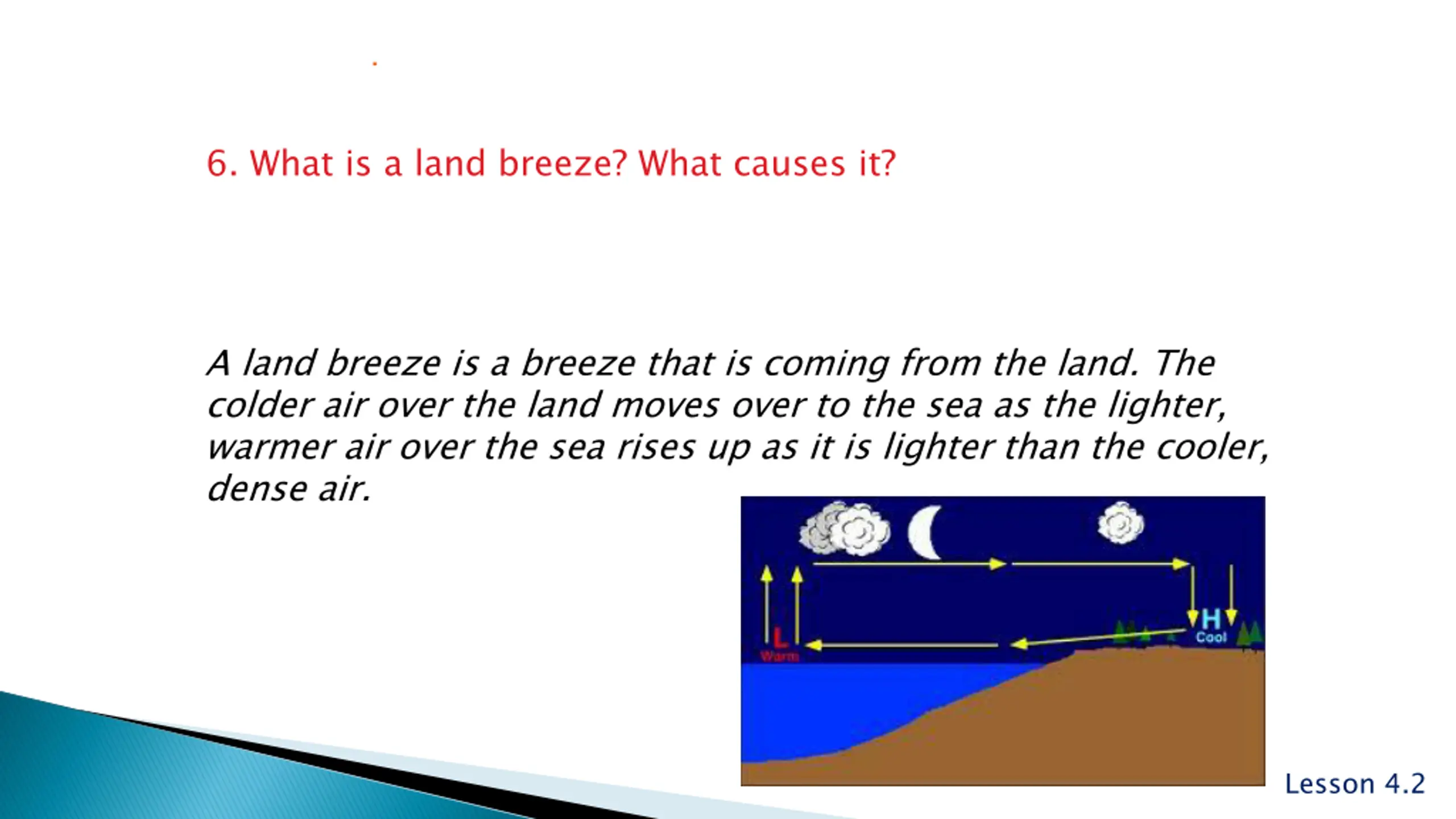 . 6. What is a land breeze? What causes it? A land breeze is a breeze that is coming from the land. The colder air over the land moves over to the sea as the lighter, warmer air over the sea rises up as it is lighter than the cooler, dense air. Lesson 4.2