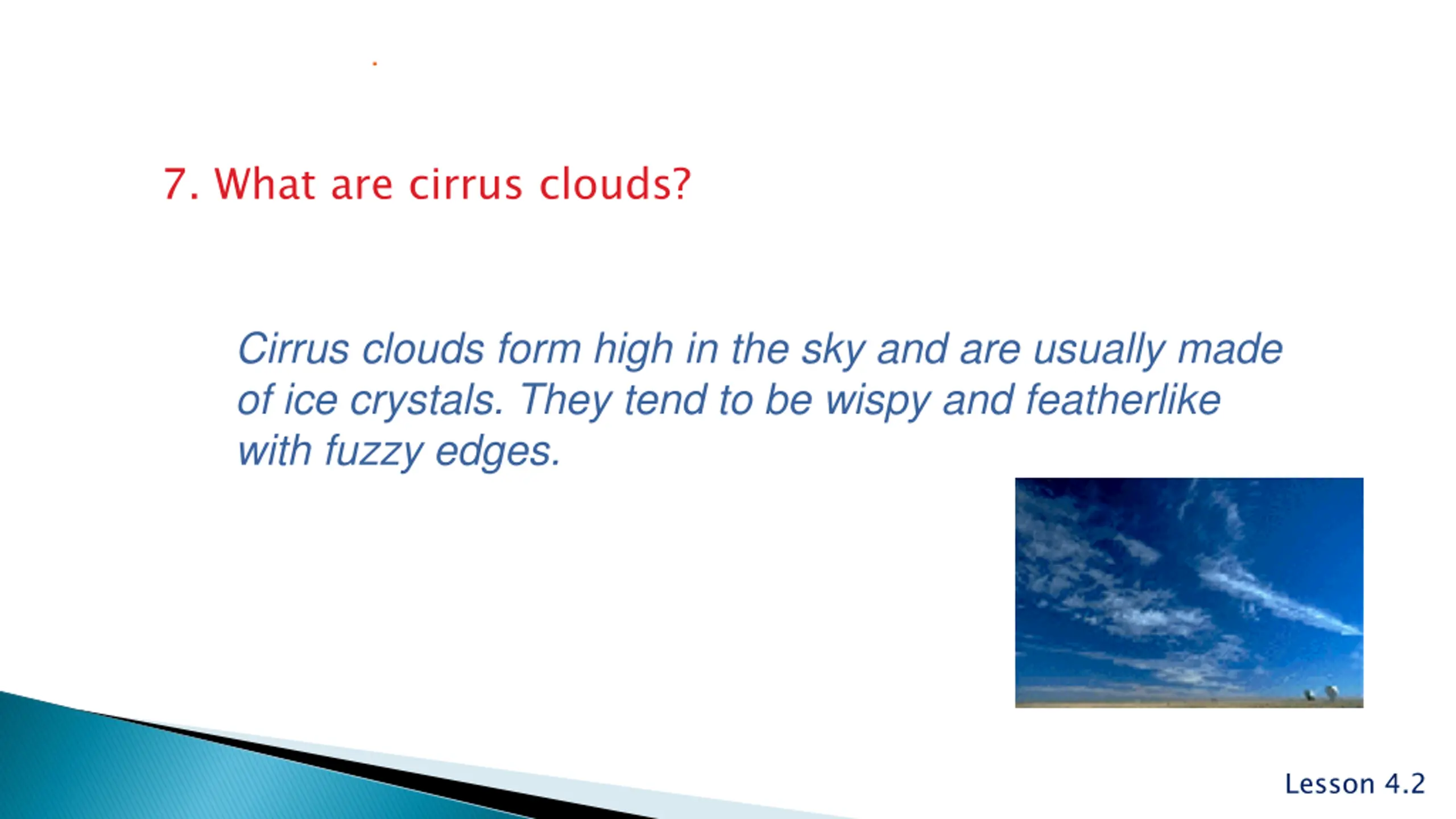 . 7. What are cirrus clouds? Cirrus clouds form high in the sky and are usually made of ice crystals. They tend to be wispy and featherlike with fuzzy edges. high clouds: cirrus Lesson 4.2