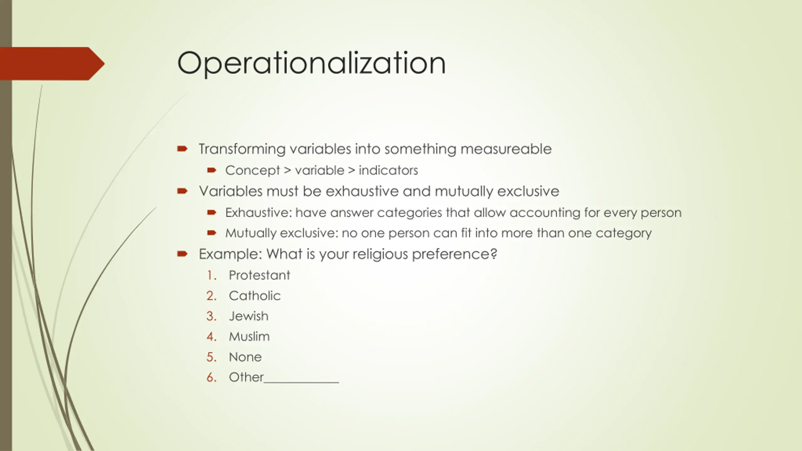 Operationalization Transforming variables into something measureable Concept > variable > indicators Variables must be exhaustive and mutually exclusive Exhaustive: have answer categories that allow accounting for every person Mutually exclusive: no one person can fit into more than one category Example: What is your religious preference? 1. Protestant 2. Catholic 3. Jewish 4. Muslim 5. None 6. Other____________