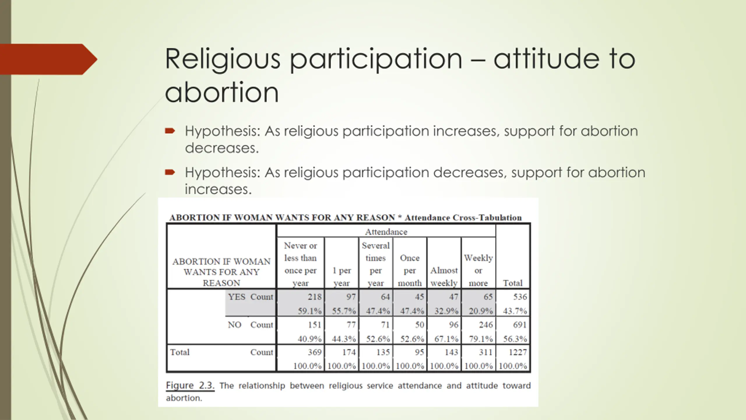 Religious participation attitude to abortion Hypothesis: As religious participation increases, support for abortion decreases. Hypothesis: As religious participation decreases, support for abortion increases.