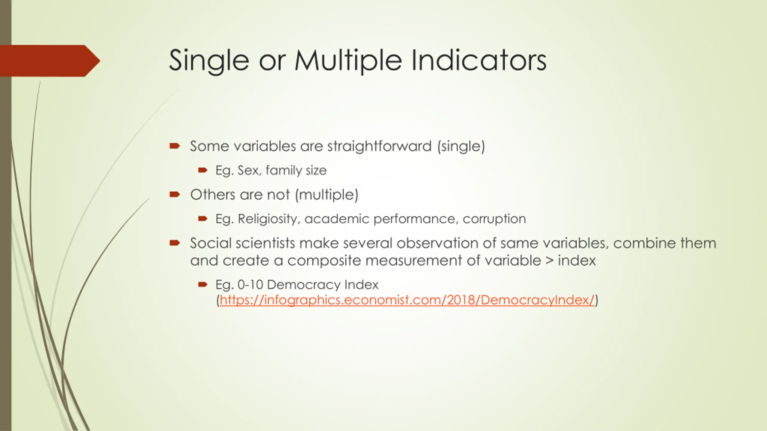 Single or Multiple Indicators Some variables are straightforward (single) Eg. Sex, family size Others are not (multiple) Eg. Religiosity, academic performance, corruption Social scientists make several observation of same variables, combine them and create a composite measurement of variable > index Eg. 0-10 Democracy Index (https://infographics.economist.com/2018/DemocracyIndex/)