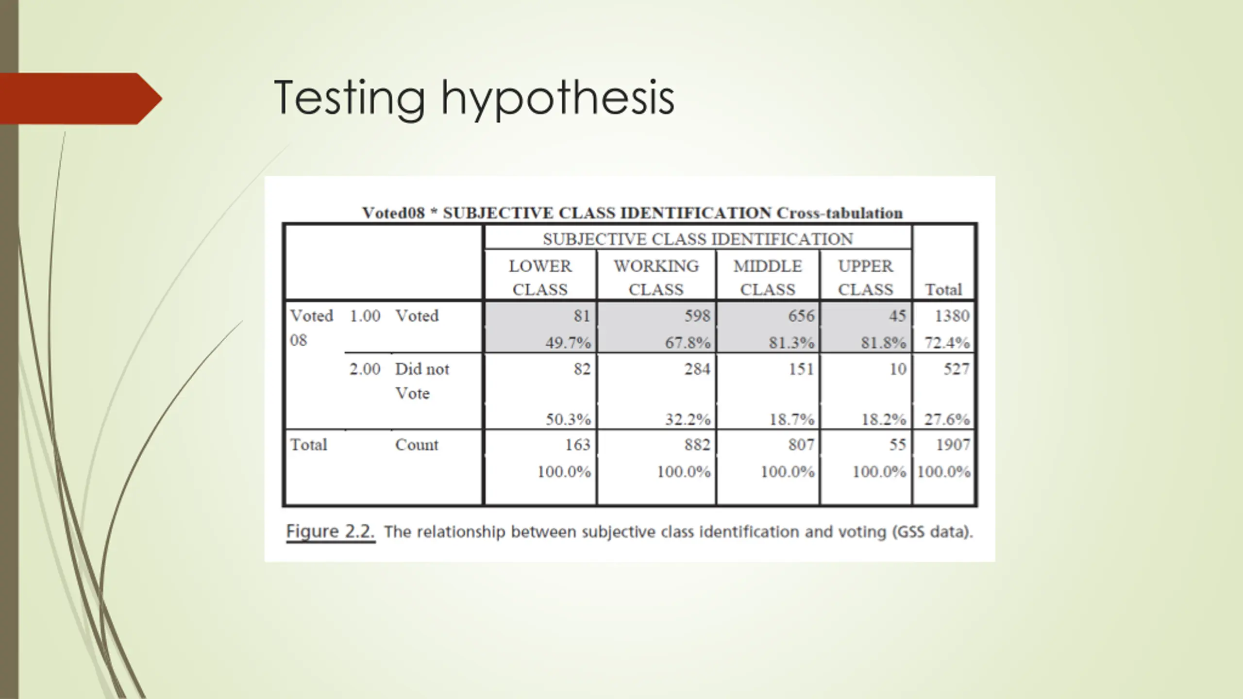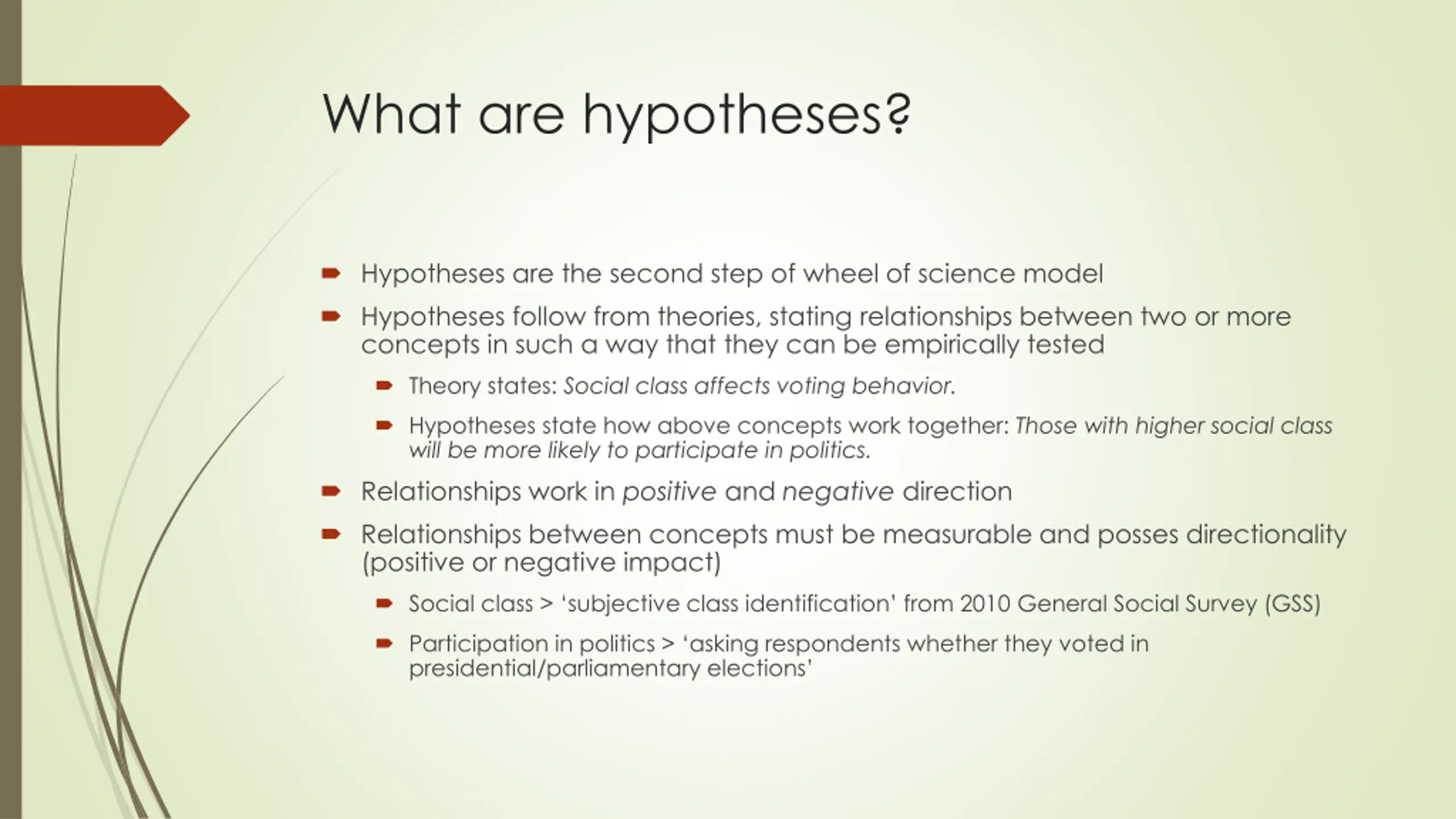 What are hypotheses? Hypotheses are the second step of wheel of science model Hypothesesfollow from theories, stating relationships between two or more concepts in such a way that they can be empirically tested Theory states: Social class affects voting behavior. Hypotheses state how above concepts work together: Those with higher social class will be more likely to participate in politics. Relationships work in positive and negative direction Relationships between concepts must be measurable and posses directionality (positive or negative impact) Social class > subjective class identification from 2010 General Social Survey (GSS) Participation in politics > asking respondents whether they voted in presidential/parliamentary elections