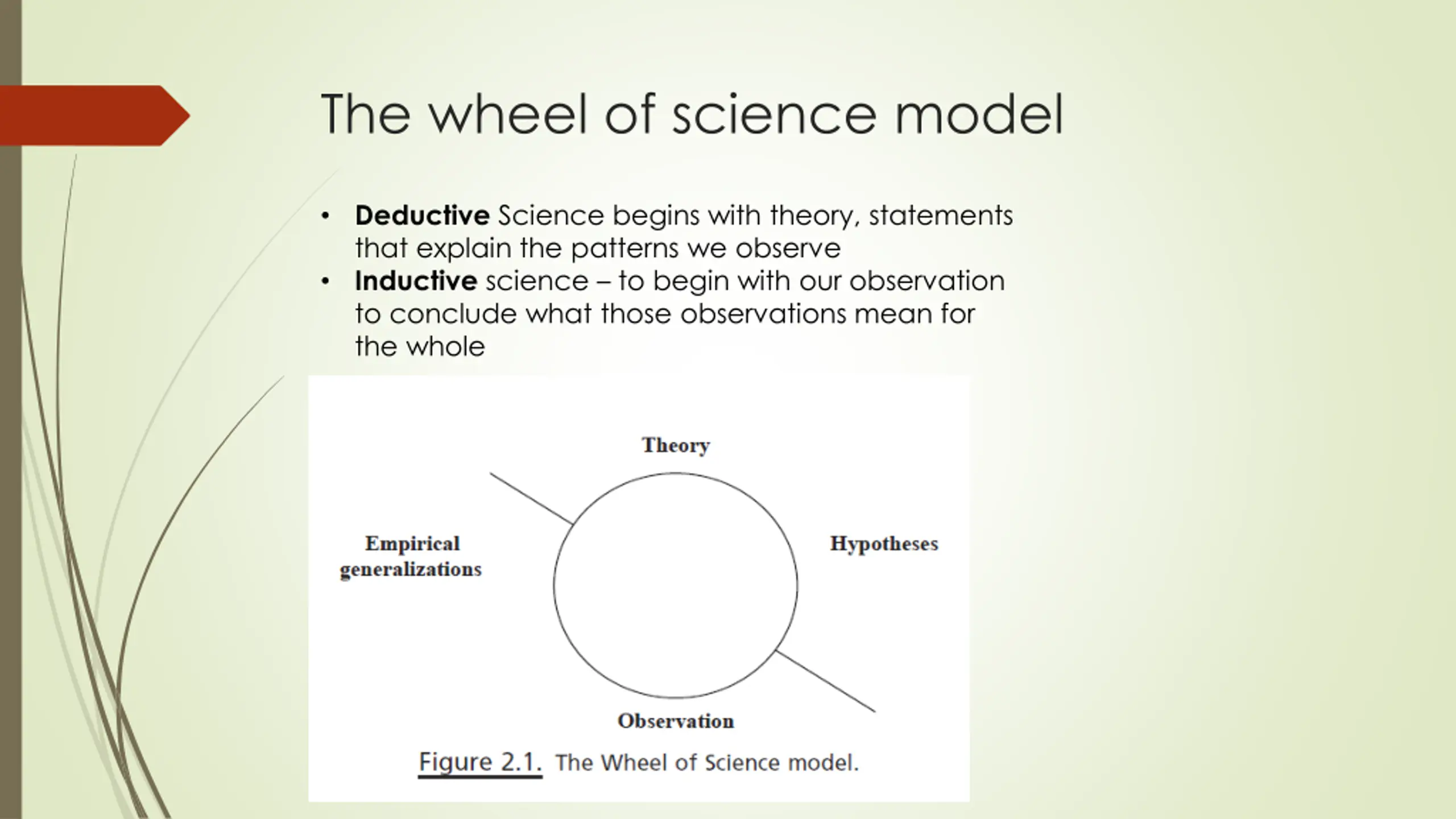 The wheel of science model Deductive Science begins with theory, statements that explain the patterns we observe Inductive science to begin with our observation to conclude what those observations mean for the whole