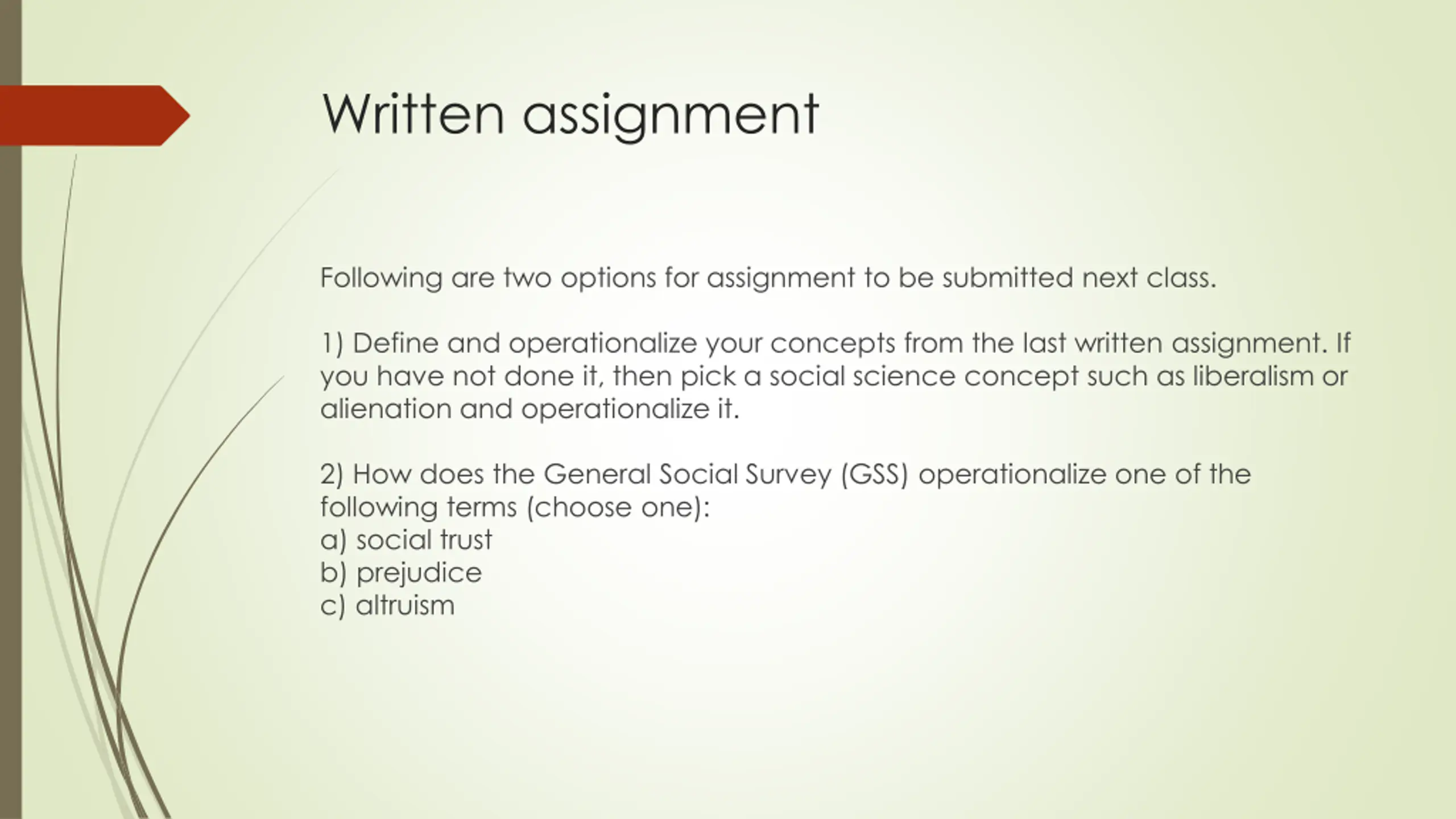 Written assignment Following are two options for assignment to be submitted next class. 1) Define and operationalize your concepts from the last written assignment. If you have not done it, then pick a social science concept such as liberalism or alienation and operationalize it. 2) How does the General Social Survey (GSS) operationalize one of the following terms (choose one): a) social trust b) prejudice c) altruism