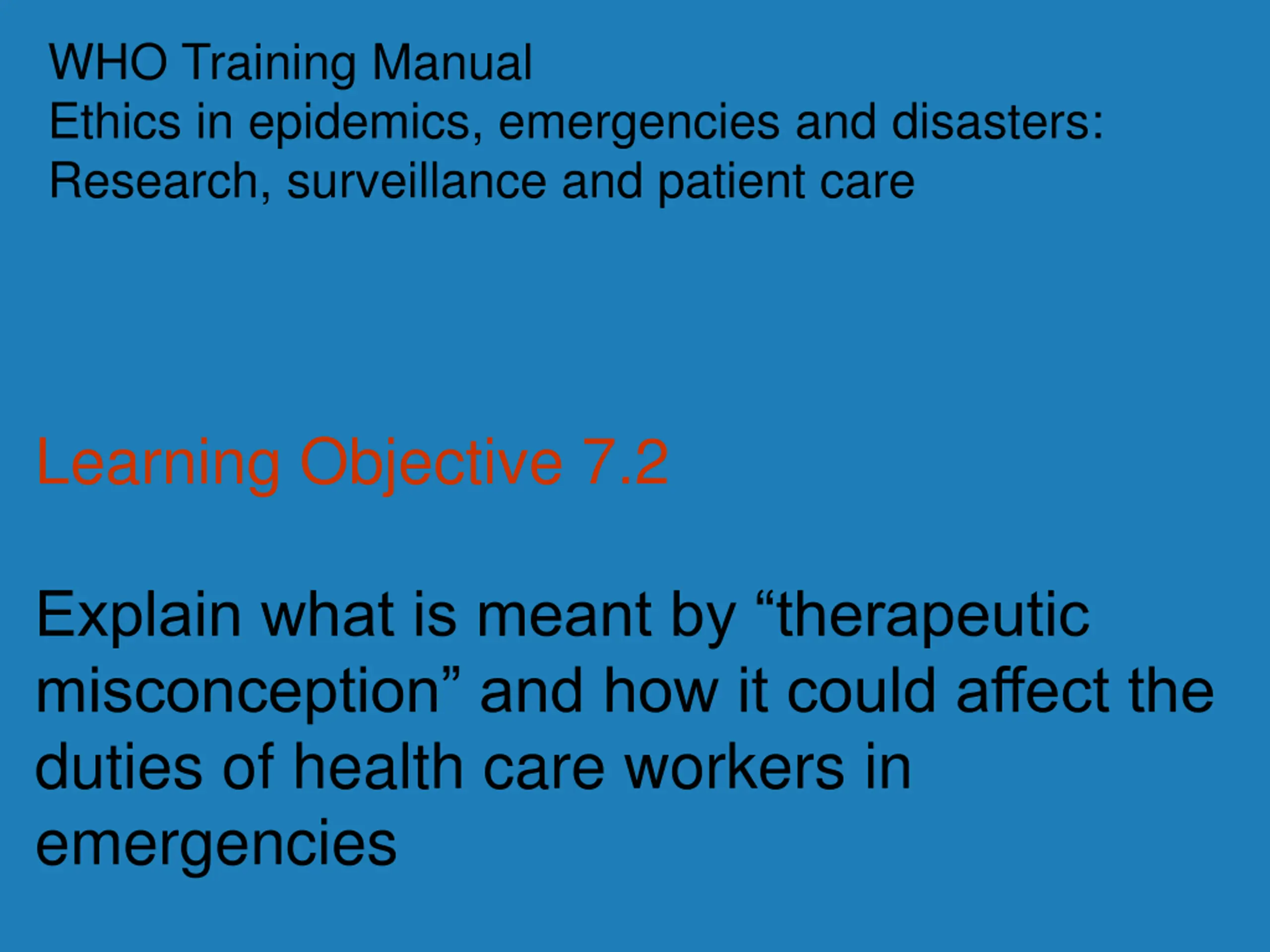 WHO Training Manual Ethics in epidemics, emergencies and disasters: Research, surveillance and patient care Learning Objective 7.2 Explain what is meant by therapeutic misconception and how it could affect the duties of health care workers in emergencies