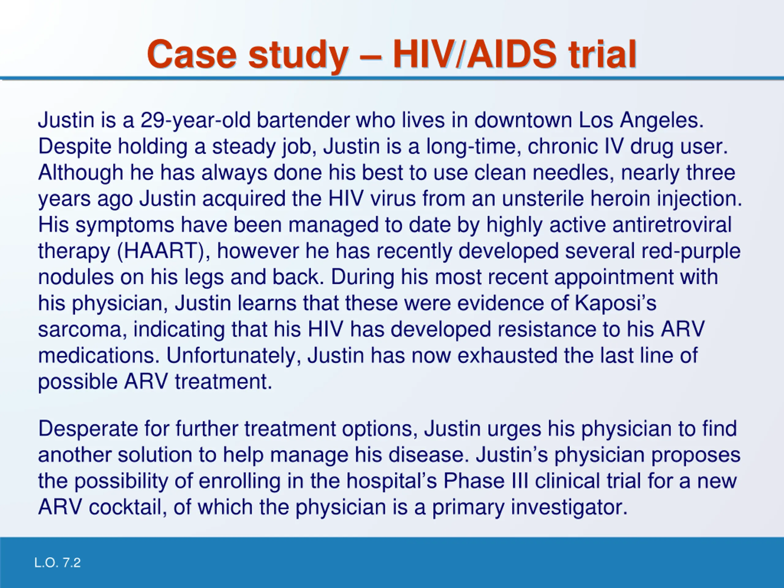 Case study HIV/AIDS trial Justin is a 29-year-old bartender who lives in downtown Los Angeles. Despite holding a steady job, Justin is a long-time, chronic IV drug user. Although he has always done his best to use clean needles, nearly three years ago Justin acquired the HIV virus from an unsterile heroin injection. His symptoms have been managed to date by highly active antiretroviral therapy (HAART), however he has recently developed several red-purple nodules on his legs and back. During his most recent appointment with his physician, Justin learns that these were evidence of Kaposi s sarcoma, indicating that his HIV has developed resistance to his ARV medications. Unfortunately, Justin has now exhausted the last line of possible ARV treatment. Desperate for further treatment options, Justin urges his physician to find another solution to help manage his disease. Justin s physician proposes the possibility of enrolling in the hospital s Phase III clinical trial for a new ARV cocktail, of which the physician is a primary investigator. L.O. 7.2