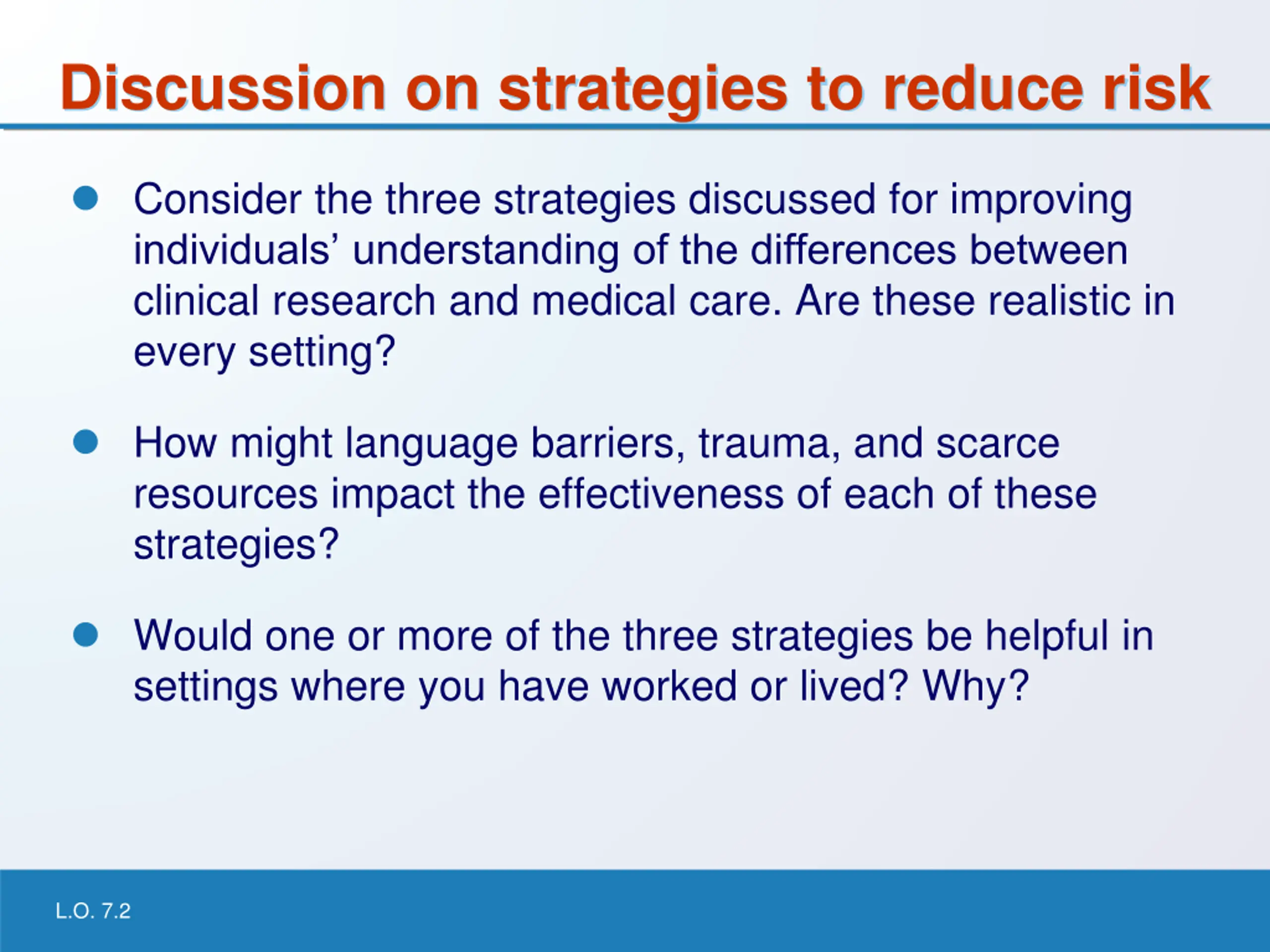 Discussion on strategies to reduce risk Consider the three strategies discussed for improving individuals understanding of the differences between clinical research and medical care. Are these realistic in every setting? How might language barriers, trauma, and scarce resources impact the effectiveness of each of these strategies? Would one or more of the three strategies be helpful in settings where you have worked or lived? Why? L.O. 7.2