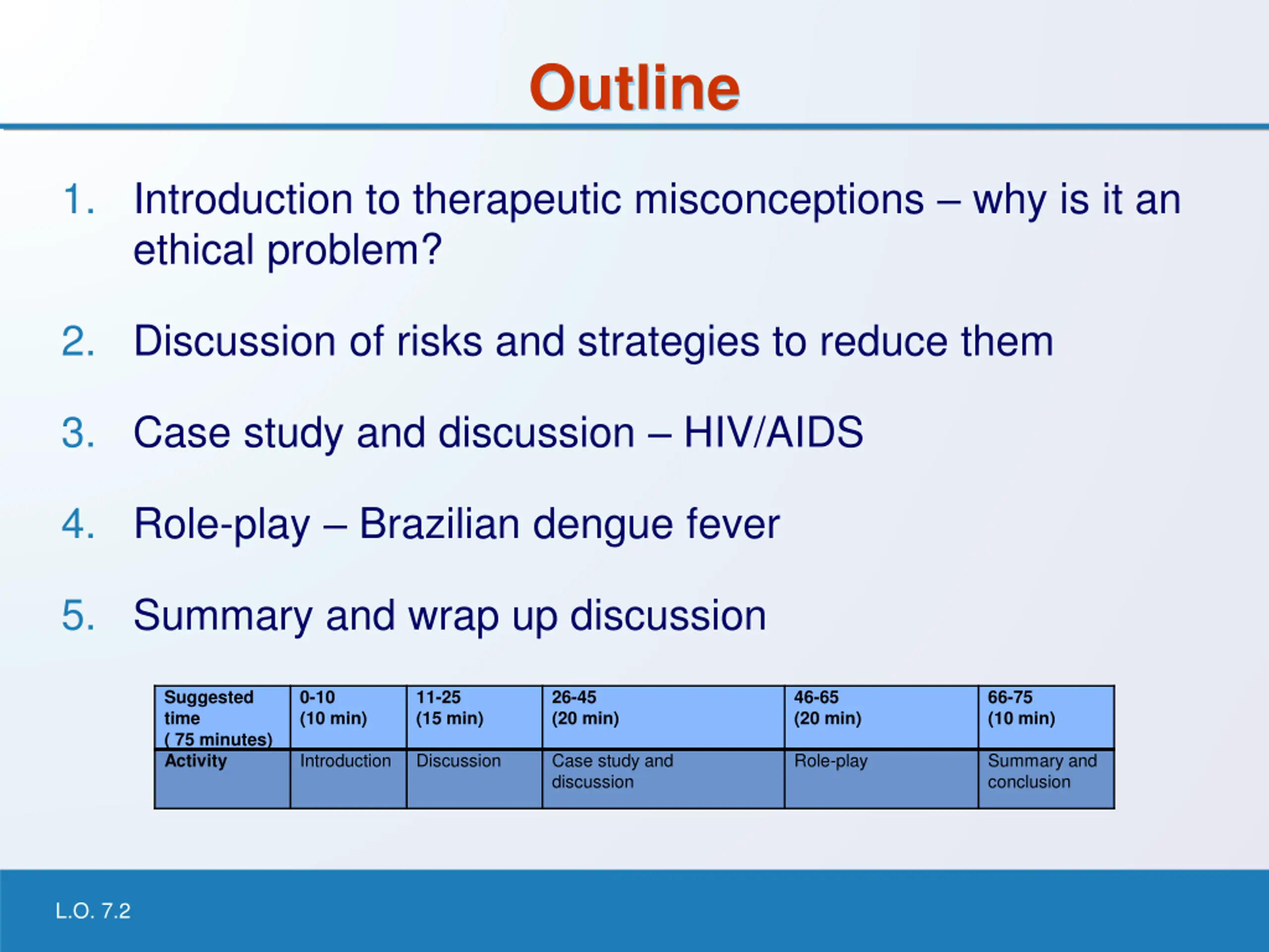 Outline 1. Introduction to therapeutic misconceptions why is it an ethical problem? 2. Discussion of risks and strategies to reduce them 3. Case study and discussion HIV/AIDS 4. Role-play Brazilian dengue fever 5. Summary and wrap up discussion Suggested time ( 75 minutes) Activity 0-10 (10 min) 11-25 (15 min) 26-45 (20 min) 46-65 (20 min) 66-75 (10 min) Introduction Discussion Case study and discussion Role-play Summary and conclusion L.O. 7.2