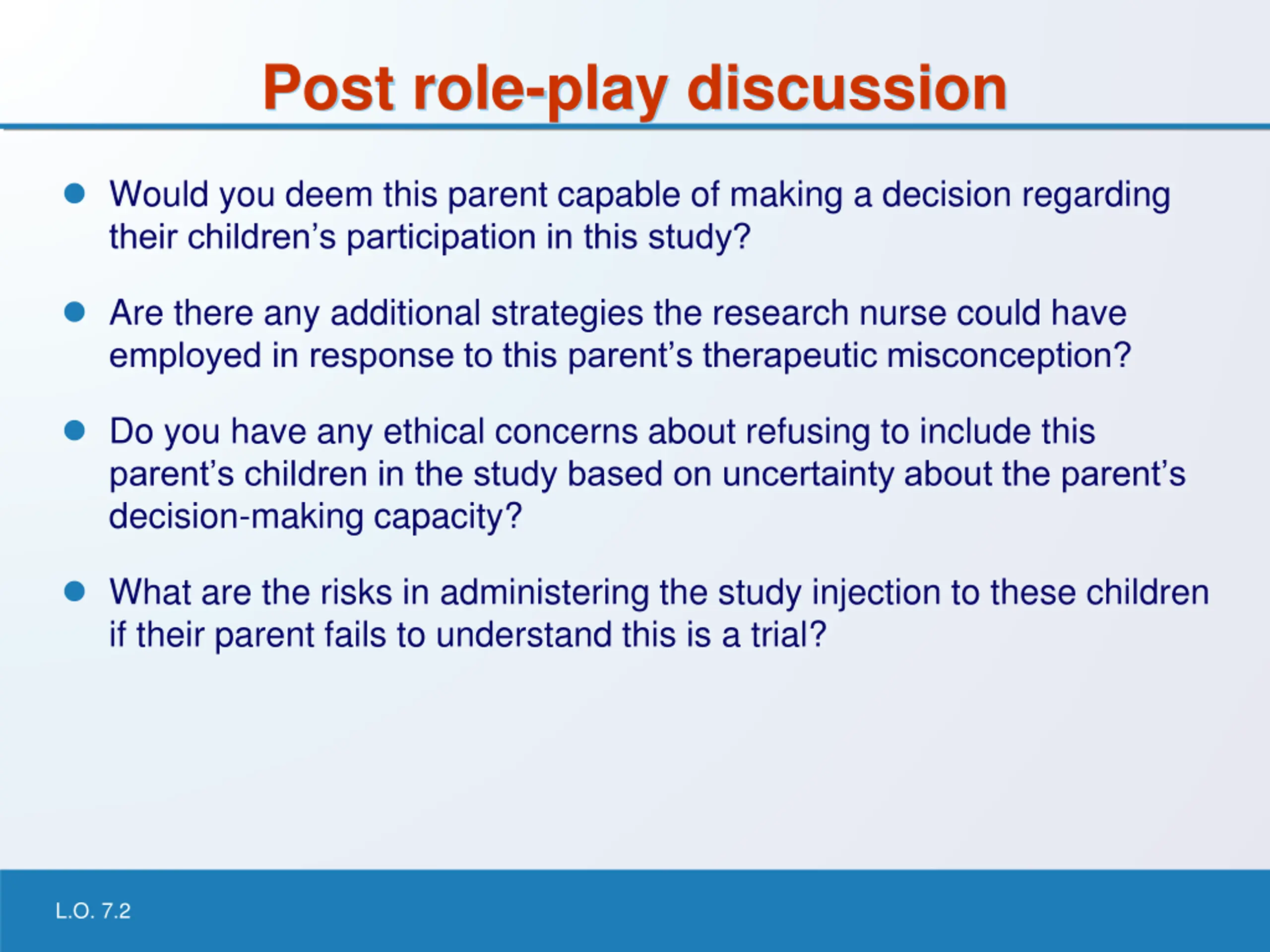 Post role-play discussion Would you deem this parent capable of making a decision regarding their children s participation in this study? Are there any additional strategies the research nurse could have employed in response to this parent s therapeutic misconception? Do you have any ethical concerns about refusing to include this parent s children in the study based on uncertainty about the parent s decision-making capacity? What are the risks in administering the study injection to these children if their parent fails to understand this is a trial? L.O. 7.2