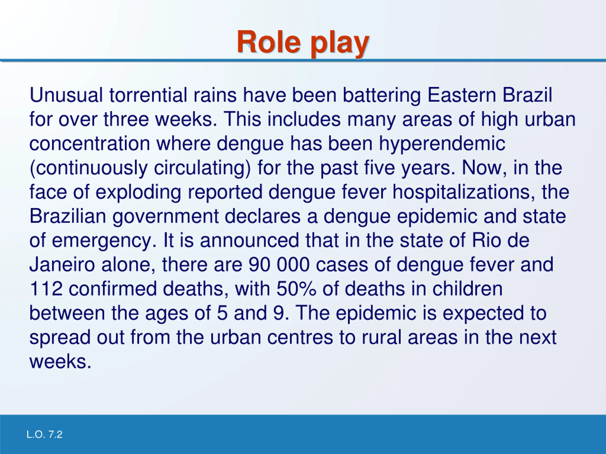 Role play Unusual torrential rains have been battering Eastern Brazil for over three weeks. This includes many areas of high urban concentration where dengue has been hyperendemic (continuously circulating) for the past five years. Now, in the face of exploding reported dengue fever hospitalizations, the Brazilian government declares a dengue epidemic and state of emergency. It is announced that in the state of Rio de Janeiro alone, there are 90 000 cases of dengue fever and 112 confirmed deaths, with 50% of deaths in children between the ages of 5 and 9. The epidemic is expected to spread out from the urban centres to rural areas in the next weeks. L.O. 7.2