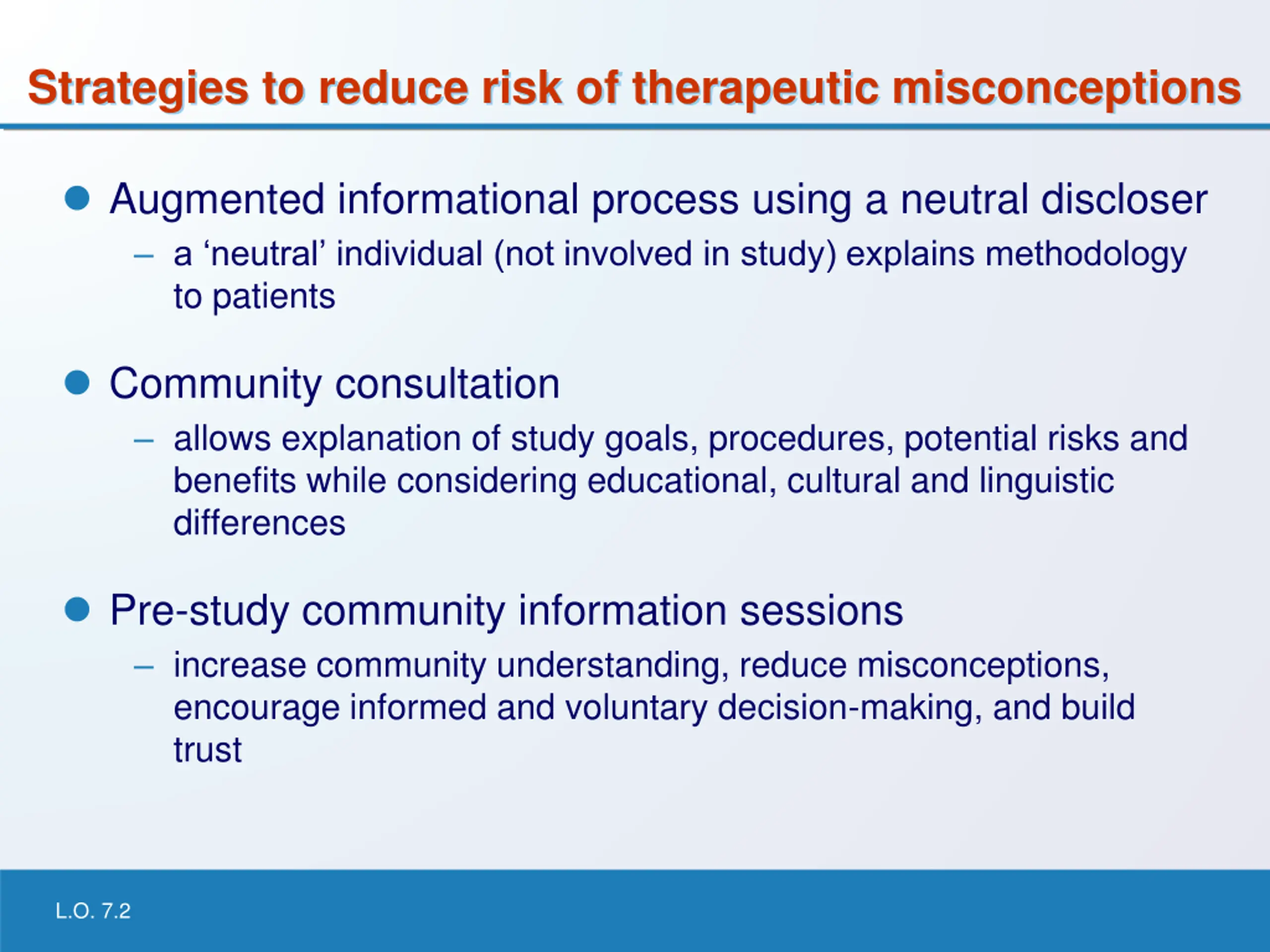 Strategies to reduce risk of therapeutic misconceptions Augmented informational process using a neutral discloser a neutral individual (not involved in study) explains methodology to patients Community consultation allows explanation of study goals, procedures, potential risks and benefits while considering educational, cultural and linguistic differences Pre-study community information sessions increase community understanding, reduce misconceptions, encourage informed and voluntary decision-making, and build trust L.O. 7.2