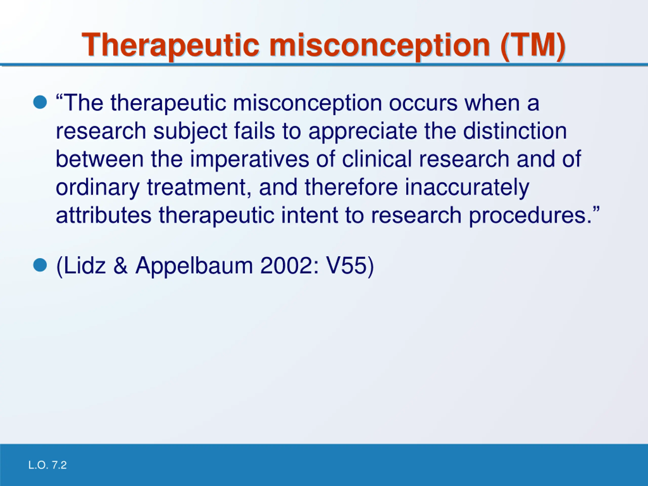 Therapeutic misconception (TM) The therapeutic misconception occurs when a research subject fails to appreciate the distinction between the imperatives of clinical research and of ordinary treatment, and therefore inaccurately attributes therapeutic intent to research procedures. (Lidz & Appelbaum 2002: V55) L.O. 7.2