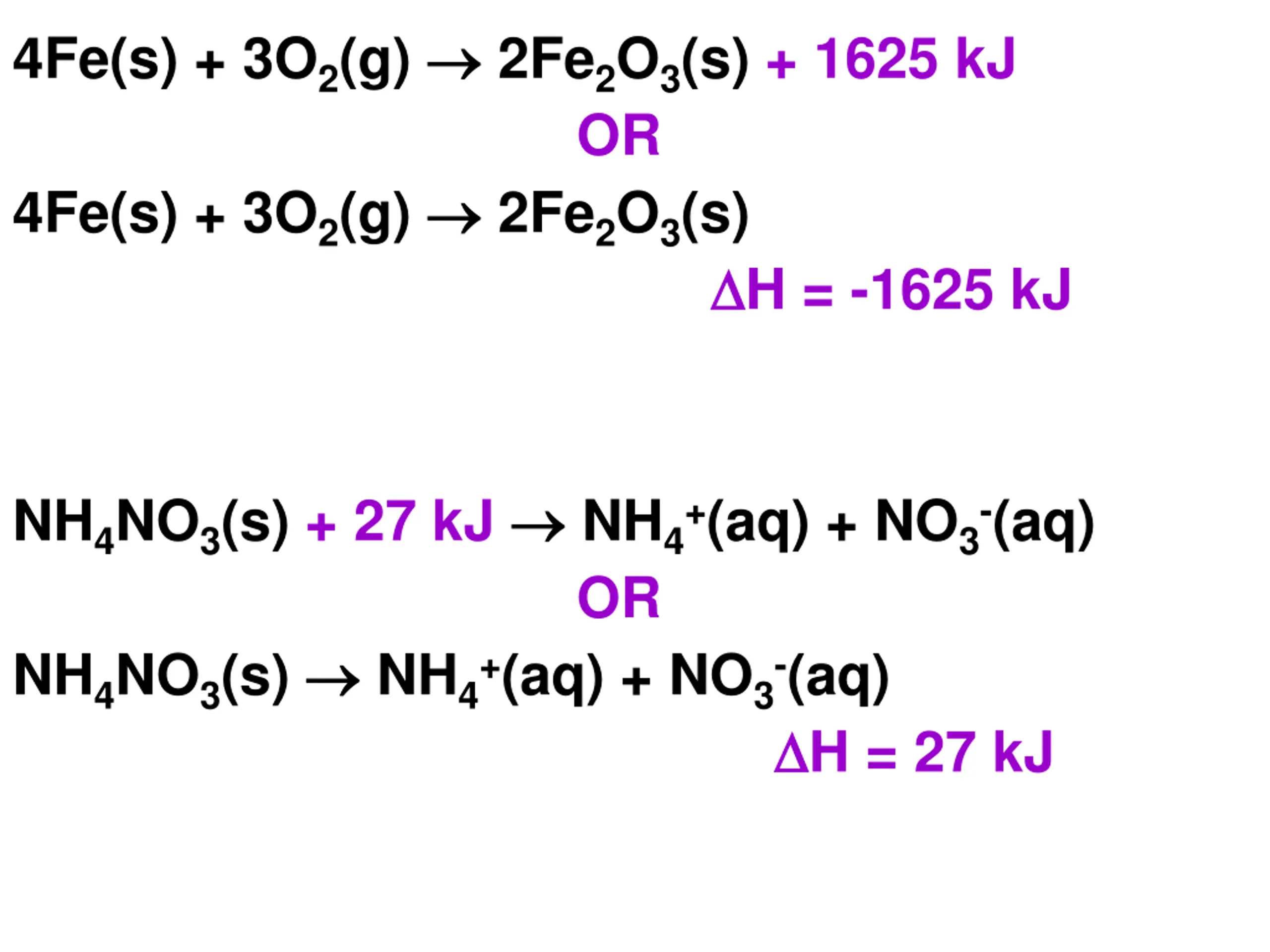 4Fe(s) + 3O2(g) 2Fe2O3(s) + 1625 kJ OR 2Fe2O3(s) 4Fe(s) + 3O2(g) H = -1625 kJ NH4NO3(s) + 27 kJ NH4+(aq) + NO3-(aq) OR NH4+(aq) + NO3-(aq) H = 27 kJ NH4NO3(s)