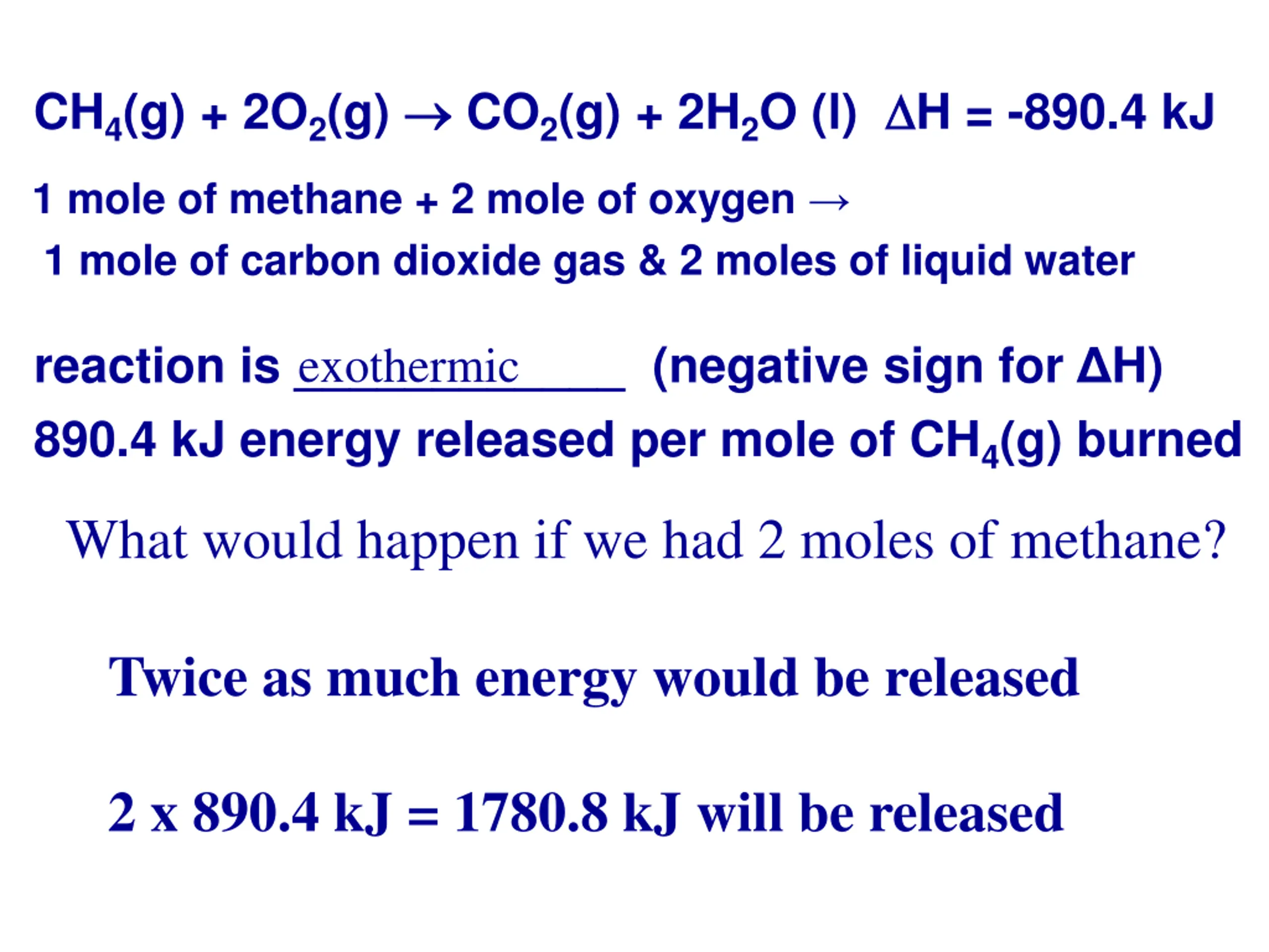 CH4(g) + 2O2(g) CO2(g) + 2H2O (l) H = -890.4 kJ 1 mole of methane + 2 mole of oxygen 1 mole of carbon dioxide gas & 2 moles of liquid water reaction is ____________ (negative sign for H) 890.4 kJ energy released per mole of CH4(g) burned exothermic What would happen if we had 2 moles of methane? Twice as much energy would be released 2 x 890.4 kJ = 1780.8 kJ will be released