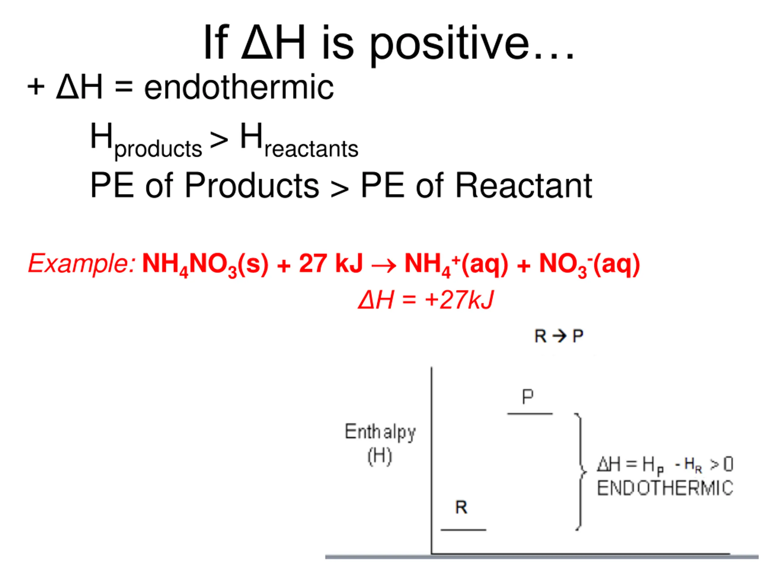 If H is positive + H = endothermic - Hproducts > Hreactants - PE of Products > PE of Reactant Example: NH4NO3(s) + 27 kJ NH4+(aq) + NO3-(aq) - H = +27kJ