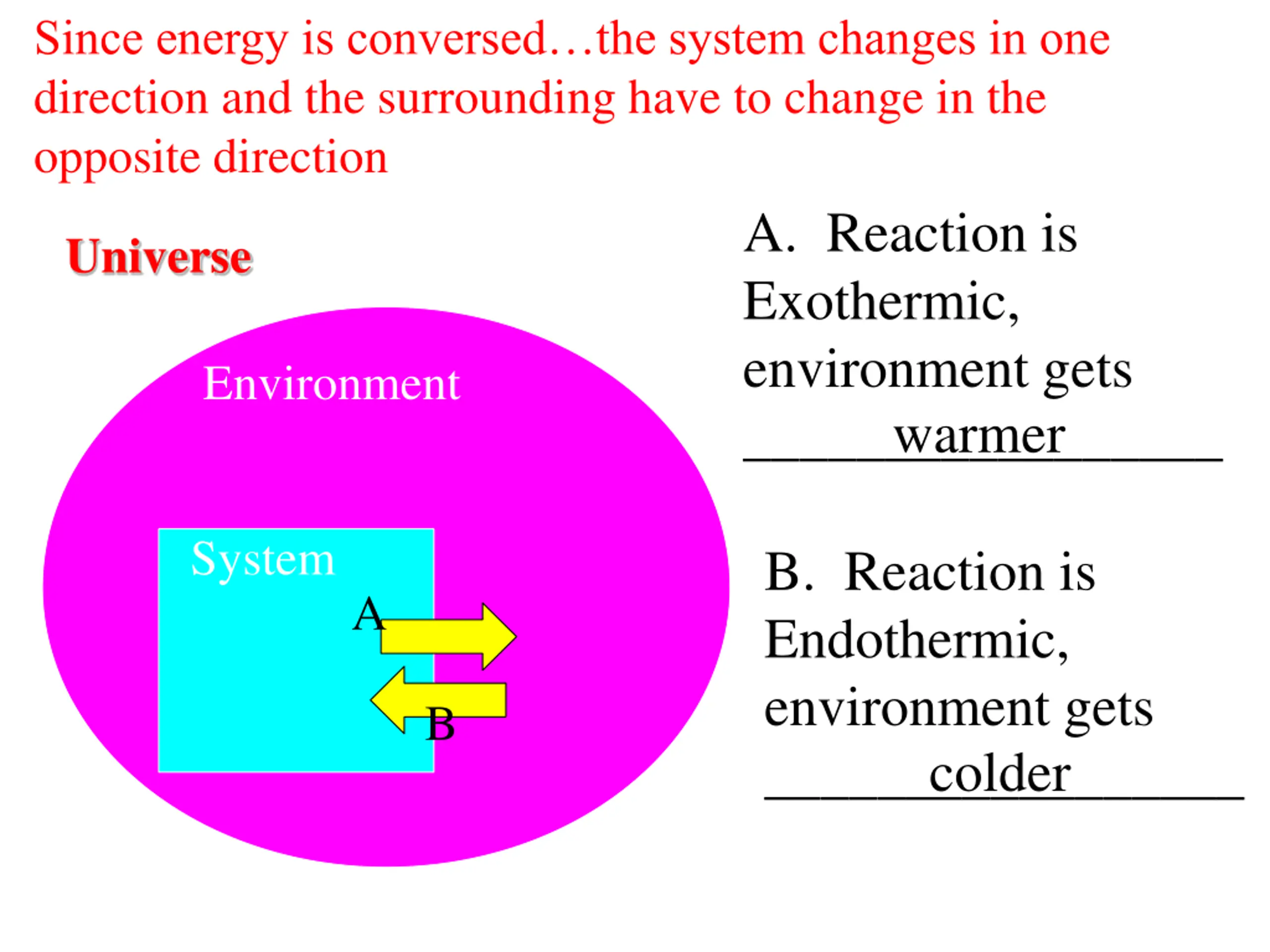 Since energy is conversedthe system changes in one direction and the surrounding have to change in the opposite direction A. Reaction is Exothermic, environment gets _________________ warmer Universe Environment System B. Reaction is Endothermic, environment gets _________________ colder A B
