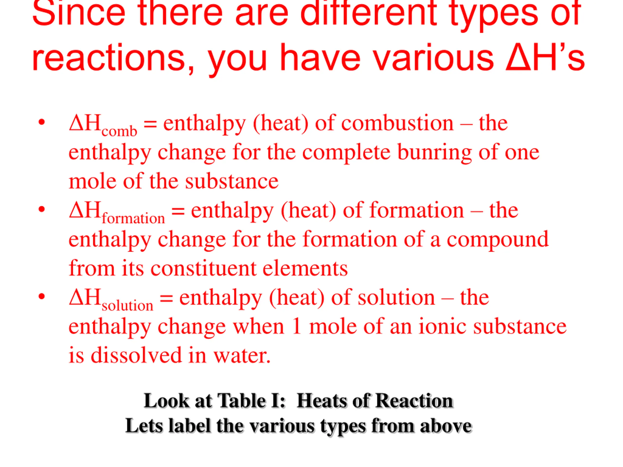 Since there are different types of reactions, you have various H s Hcomb = enthalpy (heat) of combustion the enthalpy change for the complete bunring of one mole of the substance Hformation = enthalpy (heat) of formation the enthalpy change for the formation of a compound from its constituent elements Hsolution = enthalpy (heat) of solution the enthalpy change when 1 mole of an ionic substance is dissolved in water. Look at Table I: Heats of Reaction Lets label the various types from above