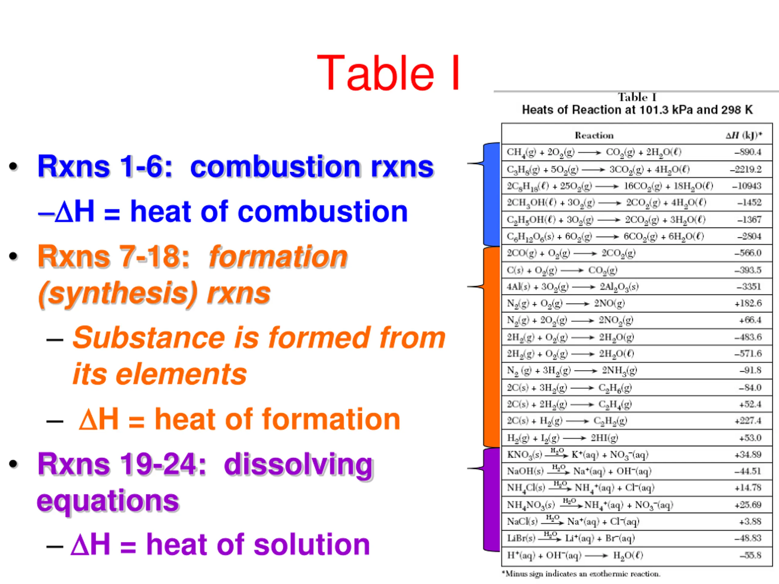 Table I Rxns 1-6: combustion rxns H = heat of combustion Rxns 7-18: formation (synthesis) rxns Substance is formed from its elements H = heat of formation Rxns 19-24: dissolving equations H = heat of solution